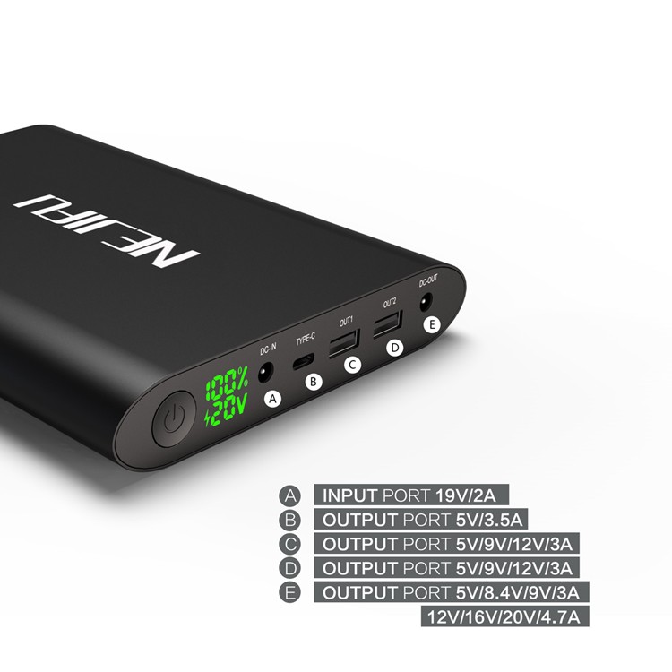 | type of battery: | Lithium-ion polymer battery | TYPE-C output: | 5V/9V/12V 3A (can charge MacBook) |