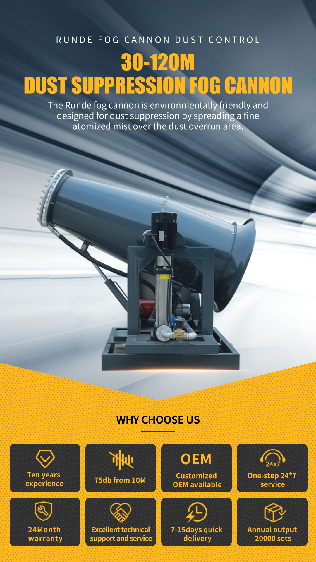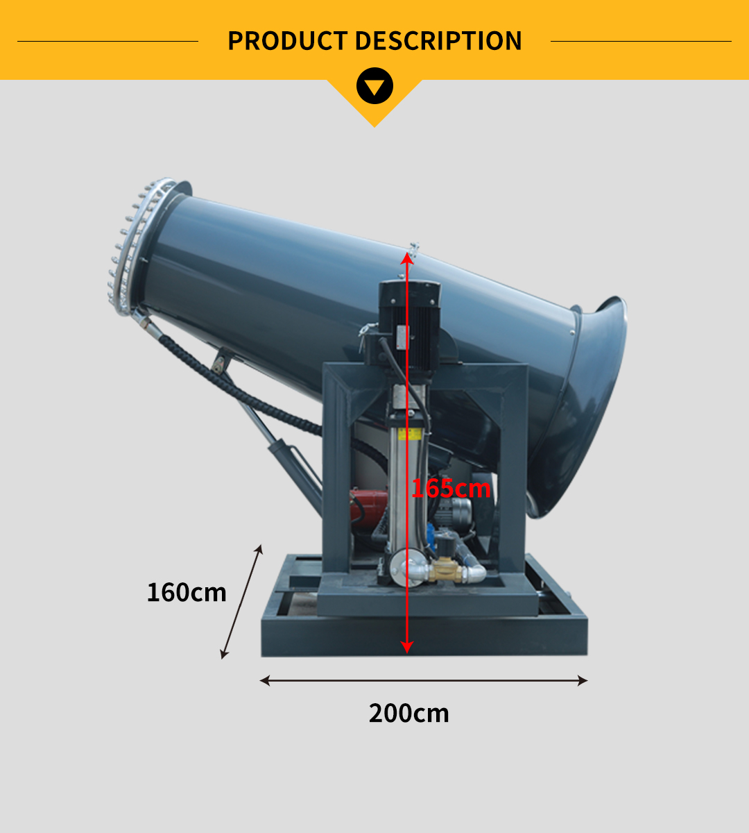 According to the principle of air supply, the dust removal gun uses advanced stainless steel centrifugal pump and fine atomizing nozzle to atomize the water, and then uses the air volume and air pressure of the fan to send the atomized water mist to a farther place. distance, so that the water mist reaches a long distance, which can cover a larger volume at the same time. These tiny artificial fog particles can float and remain suspended in the air for long periods of time. The fog produced by a single nozzle can be up to 3-5 meters long and 1 meter wide, and the water mist and dust will condense after falling, so as to achieve the purpose of dust reduction.