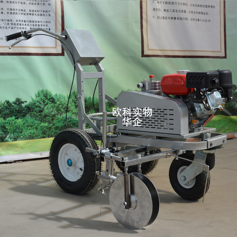 Hand-push cold paint marking machine ensuresStable pressure, easy to use and easy to maintain,Using high-pressure airless spraying technology, simple control, good damping effect, linear change to minimize fluctuations caused by paving,
