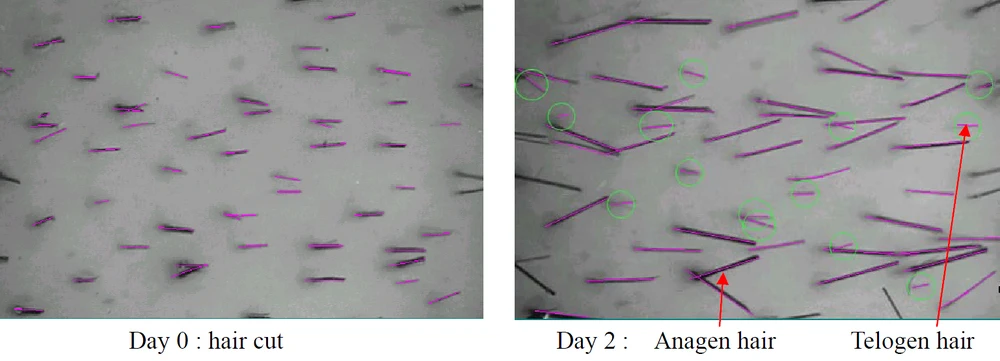 In a given subject, marked differences were observed, T0 vs. T4 months. As shown below, the bulb zone of telogen hair has been very markedly improved: