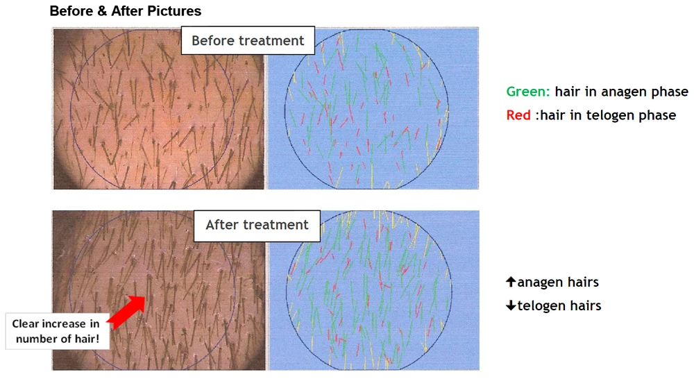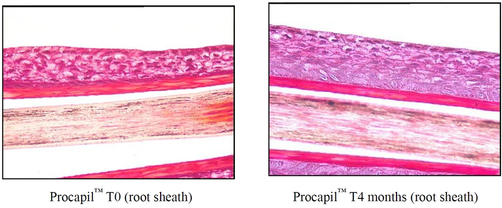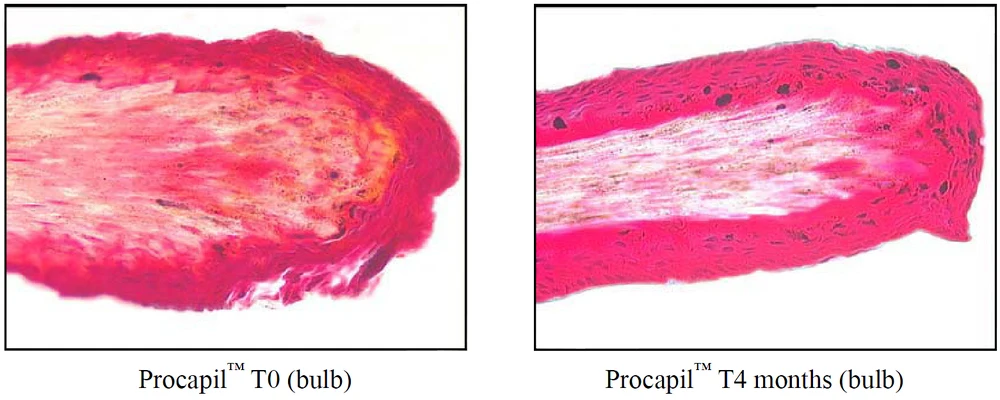 Clinical studies were performed on 18 volunteers using Procapil™ and 17 volunteers with a placebo over a duration of 4 months. At the conclusion of the study, 67% of the volunteers experienced an increase in their anagen hair. Hair bulb cells were structured to be thicker and more able to provide optimum anchoring. Procapil™ has a repair and protection effect on the structure components of the hair follicle, slowing down the aging process.