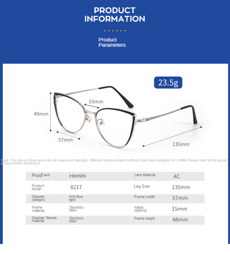 metal frame Anti-blue light glasses - long-term exposure to computers and TVs, the blue light emitted by the screen will cause damage to the eyes, and the eyes will feel tired, teary, and dizzy. In severe cases, it can cause migraines and even affect the quality of your sleep. Women's Blue Light Glasses - Our blue light blocking glasses can solve the troubles caused by electronic screens. Reduce glare and visual fatigue and discomfort from working behind screens. Improve our sleep quality. Let us work more easily, let the game bring us more happiness. Women's Cat Eye Glasses - The frame and temples of our blue light glasses are made of memory metal. It not only ensures that its weight is very light, but also very durable. Durable and suitable for long-term wearing. Clear lenses won't obstruct your vision. You will get a very good visual experience. Women's Fashion Glasses - Stylish cat eye glasses design, suitable for all face shapes. Not only does it protect your eyes from blue light, but you also get a nice looking frame. You can even use it as a decoration. Whether you are walking on the street, working, or watching videos and playing games, this design will make you more fashionable and dazzling. Women's Cat Eye Blue Light Glasses Exclusive Service - We believe in our products and we want to sell better blue light blocking glasses. If you have any questions, please contact us, we will provide the best service until you are satisfied. We are here all the time. |