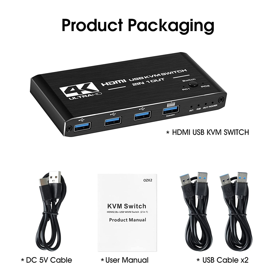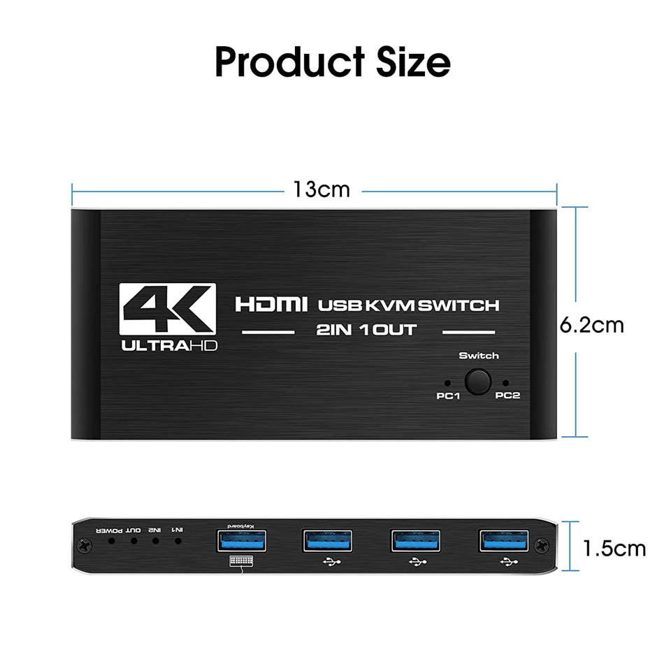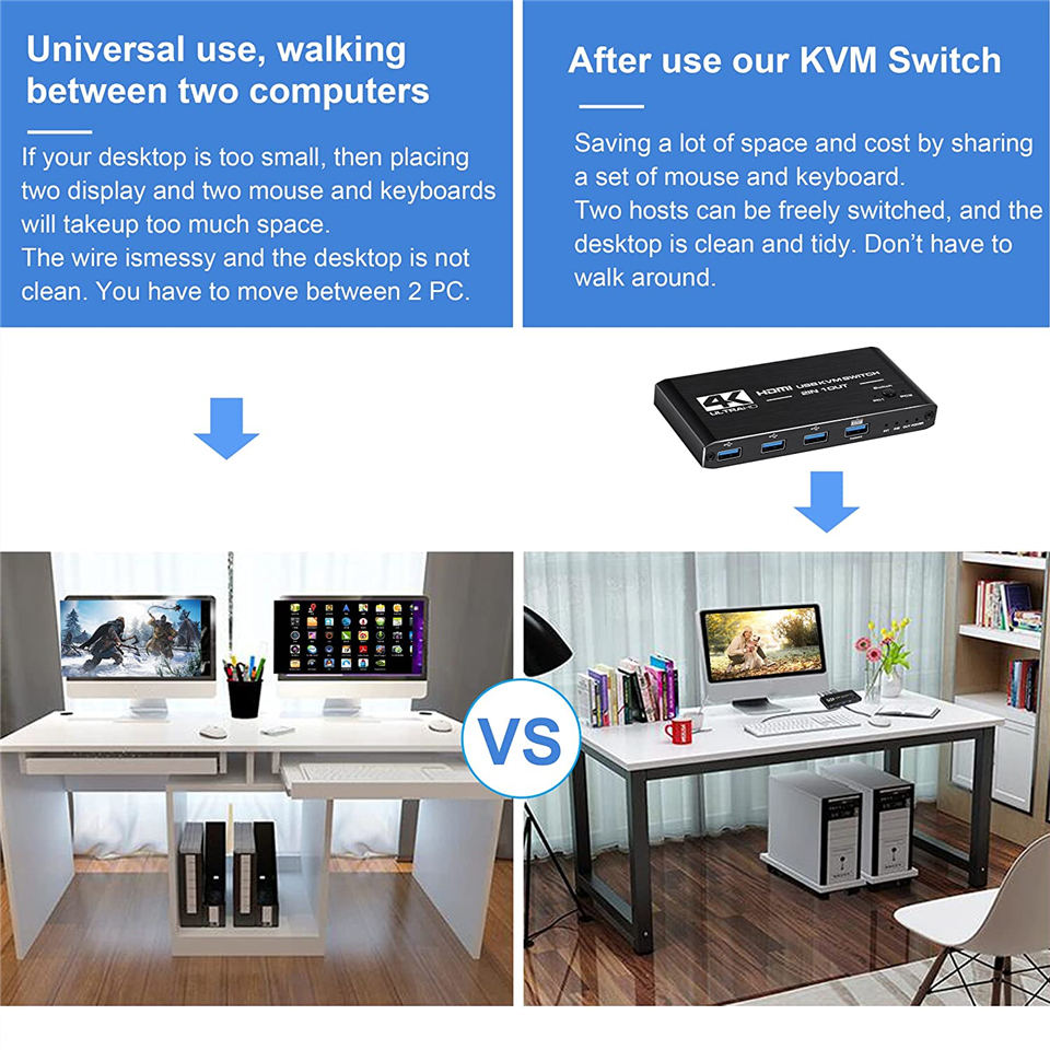 [USB KVM HDMI Switch 2 Port] Keyboard Mouse KVM Switch allows you to control 2 computers using only one set of controls (mouse and keyboard) and one monitor. High-precision encryption chips, gold-plated interfaces, easy to work and home, making your work and home life simpler and easier.