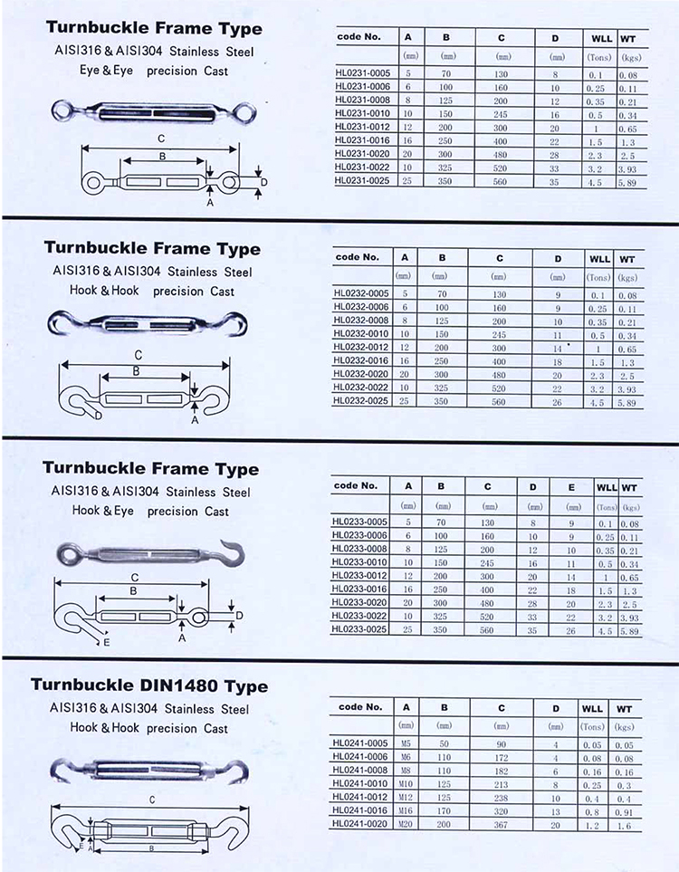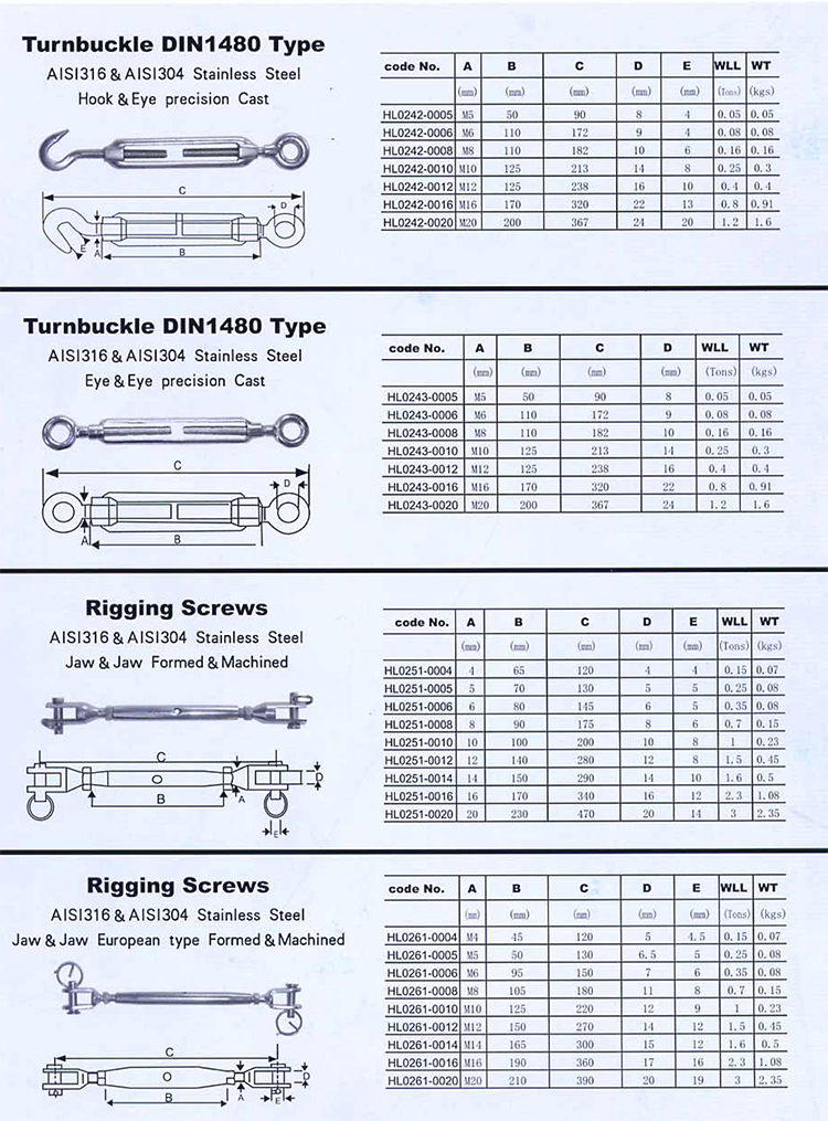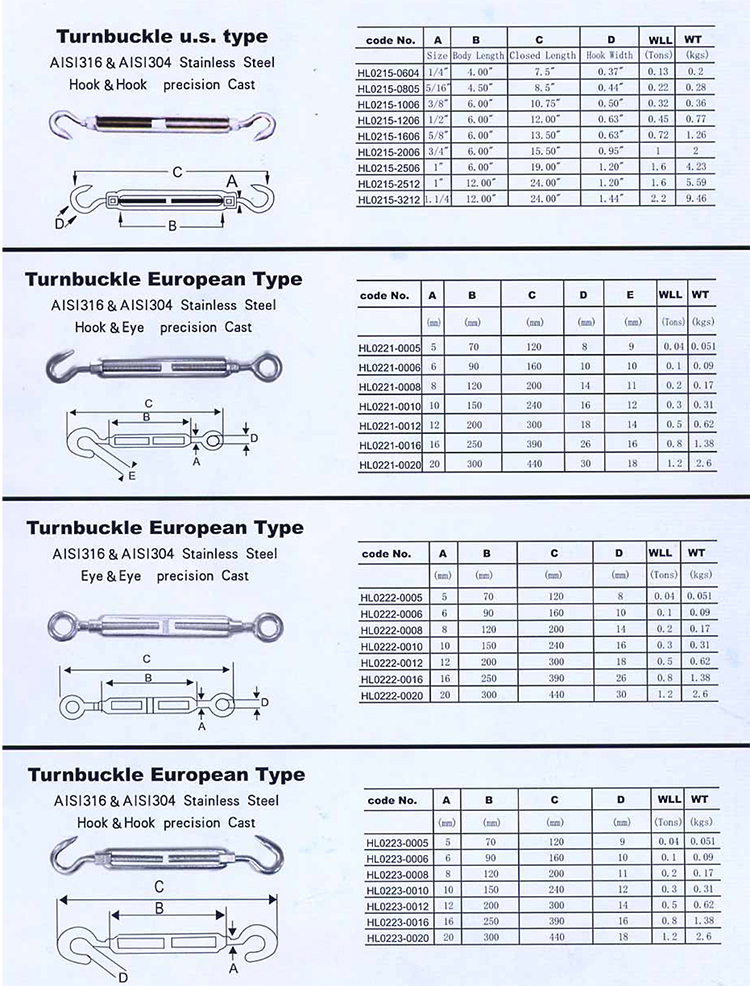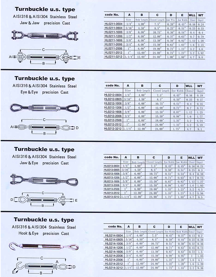 AISI304/AISI316 stainless steel open body turnbuckles, customized standard or non-standard wire rope turnbuckles