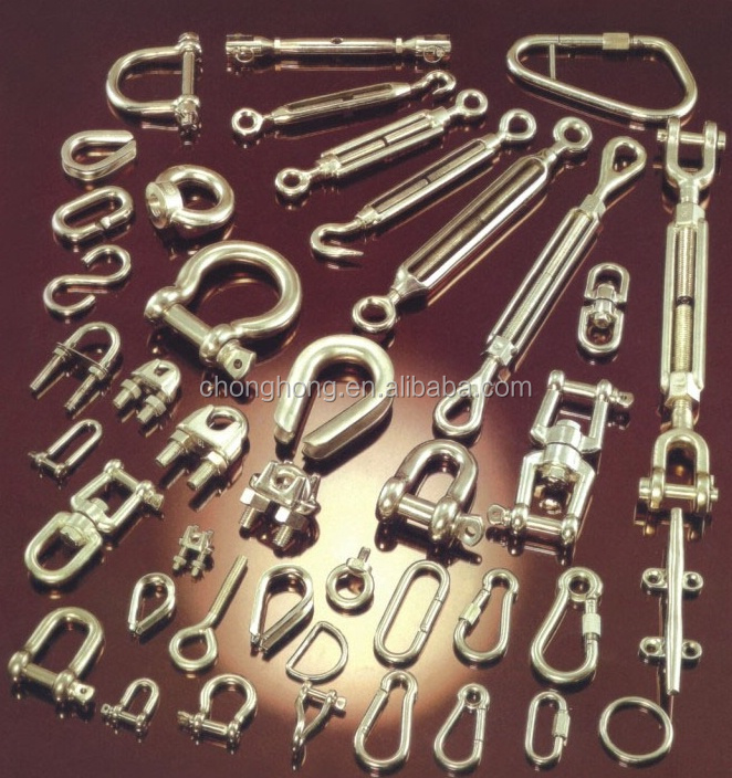 Eyebolts, turnbuckles, wire rope clips, shackles, chain fittings, staplers, hooks, thimbles, connecting links, master links, anchors, lashing accessories, swivels and many other rigging hardware. |