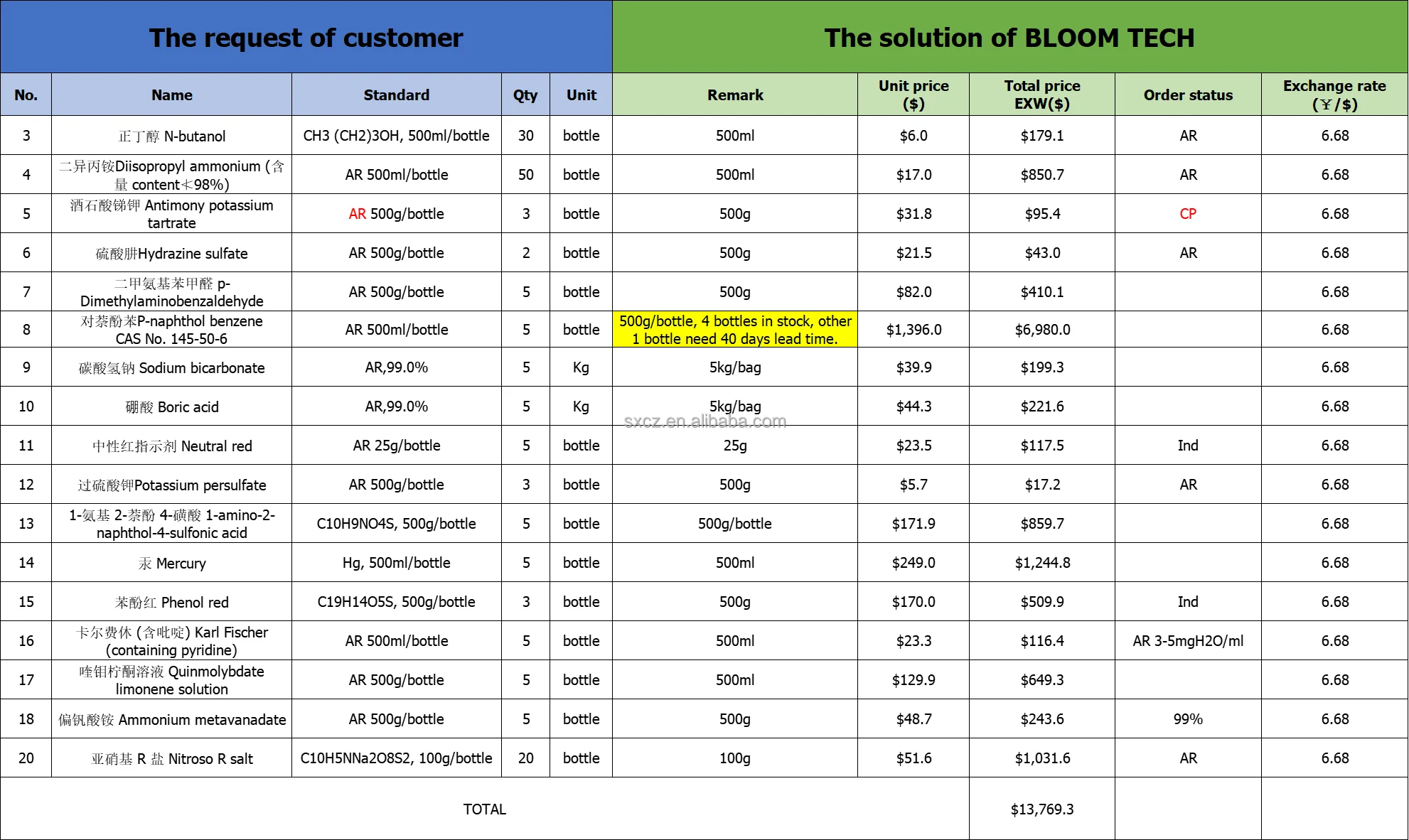 2.Please send the Clear chemical name and Quantity(Weight--Solid, Volume--Liquid) to us, our sales Dept. will provide the one-for-one service for you(General unit: g, kg, ton, mL, L etc.)