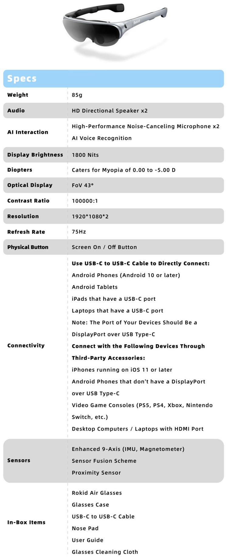 Rokid Air AR glasses are powerful, intuitive and lightweight enough for everyday use. Just put them on to experience a huge 120-inch virtual screen, providing an unprecedented immersive multimedia experience for apps, games and movies. With voice control and advanced features, you can see more and operate hands-free with Rokid Air.