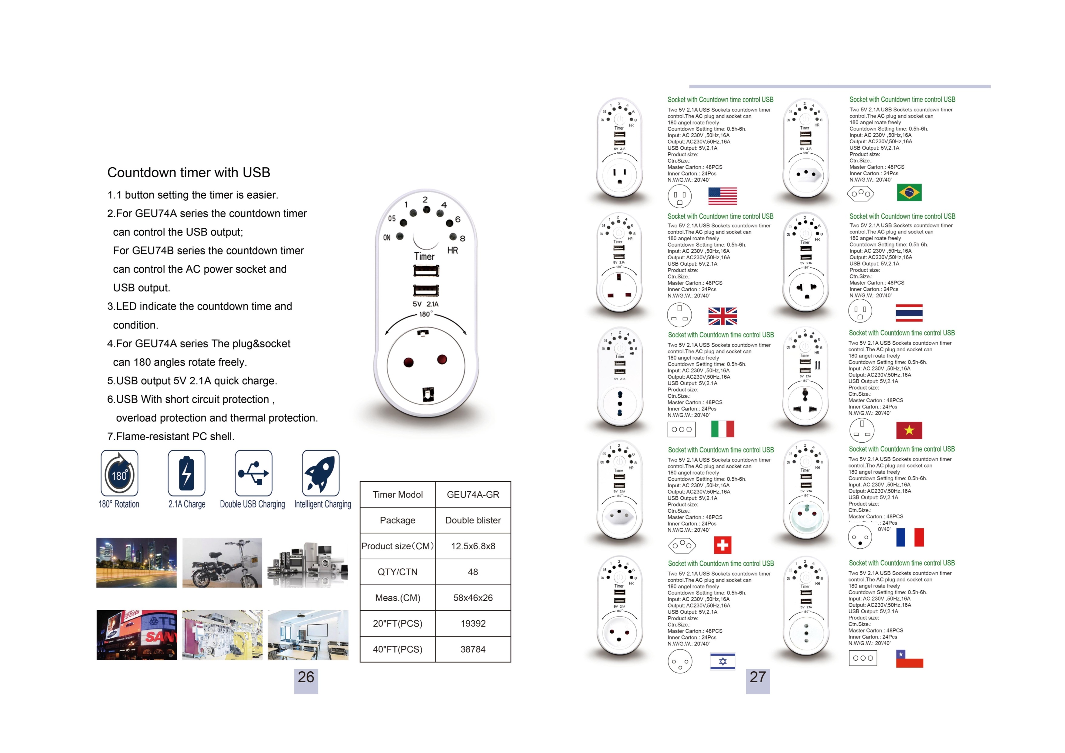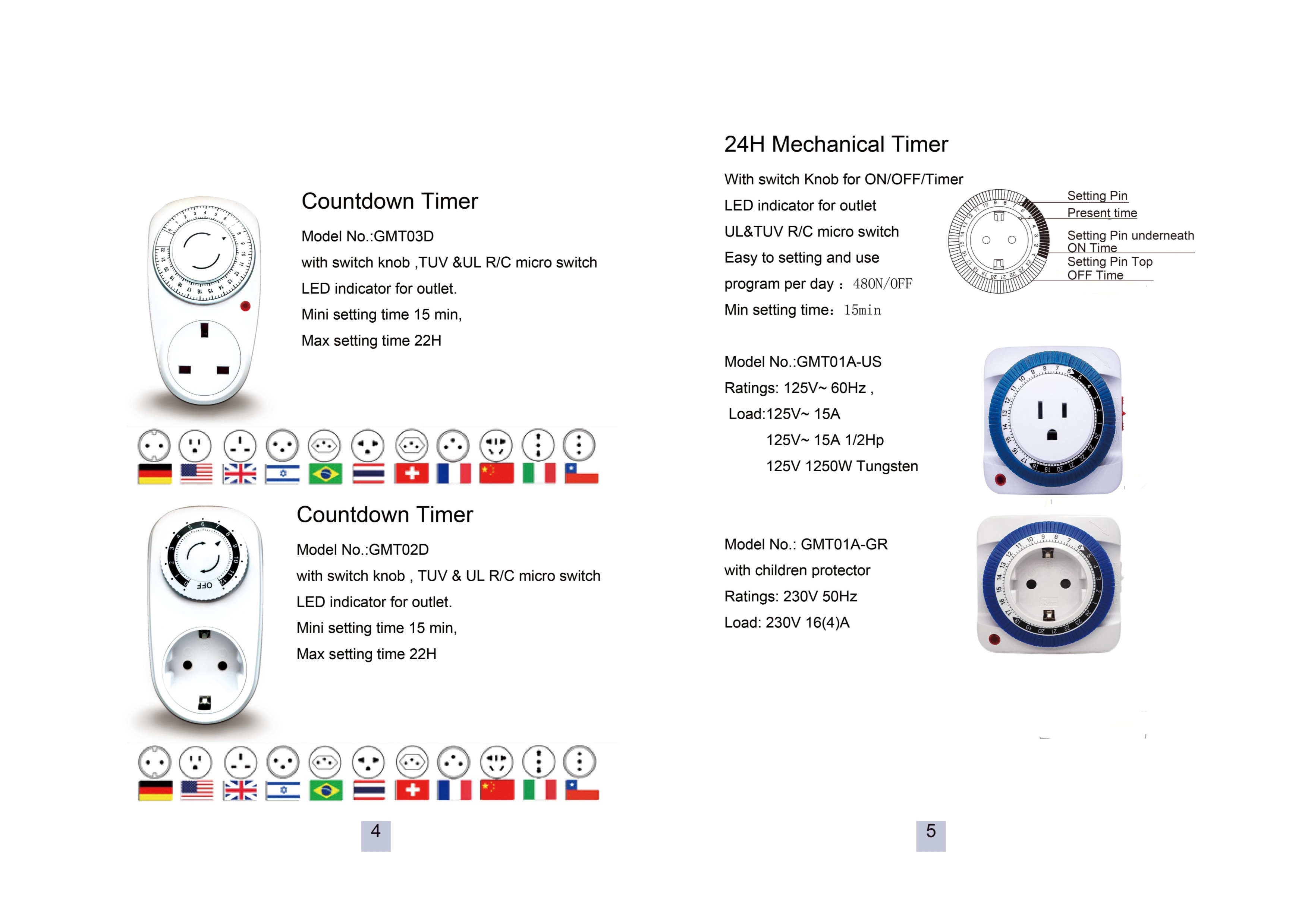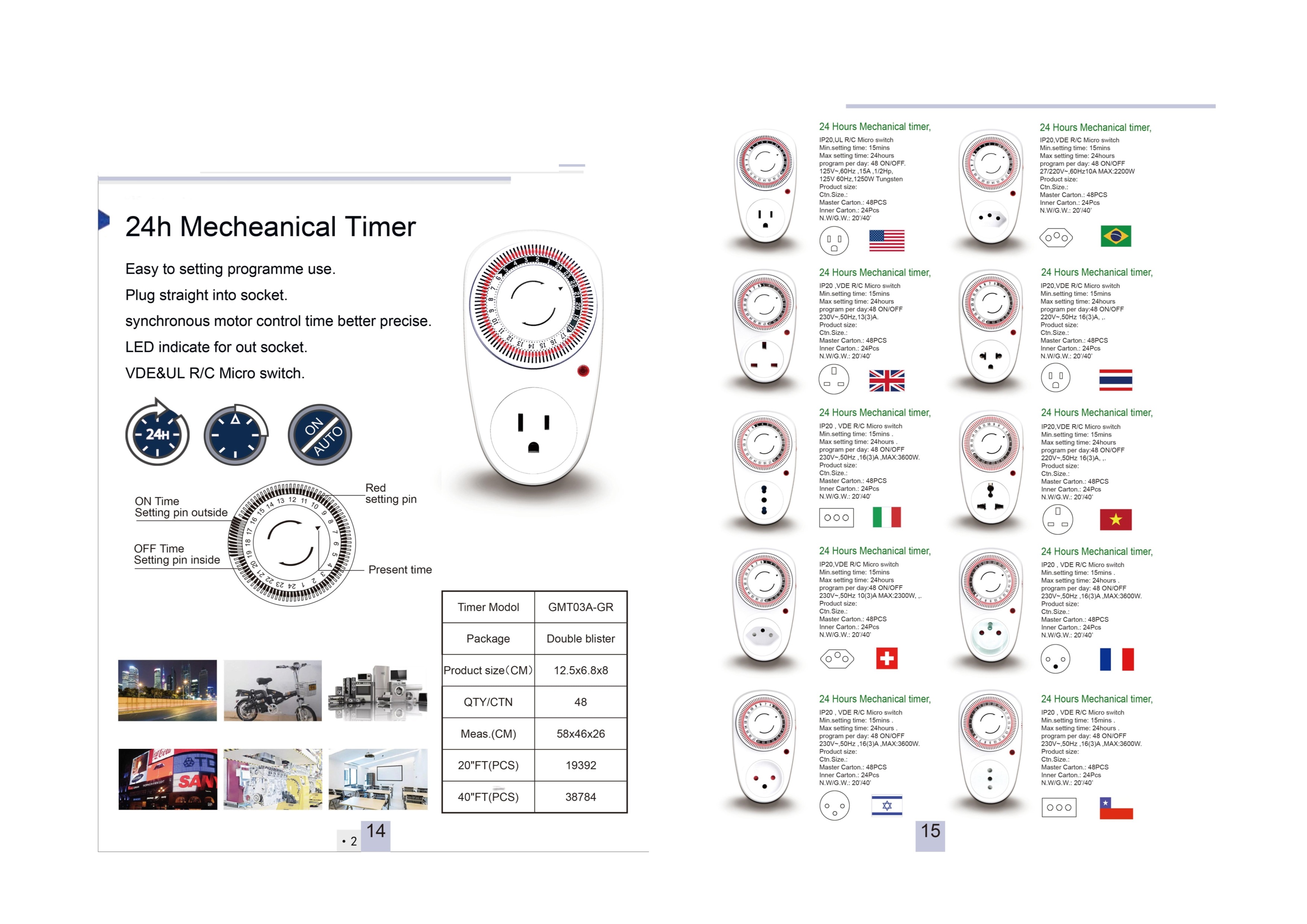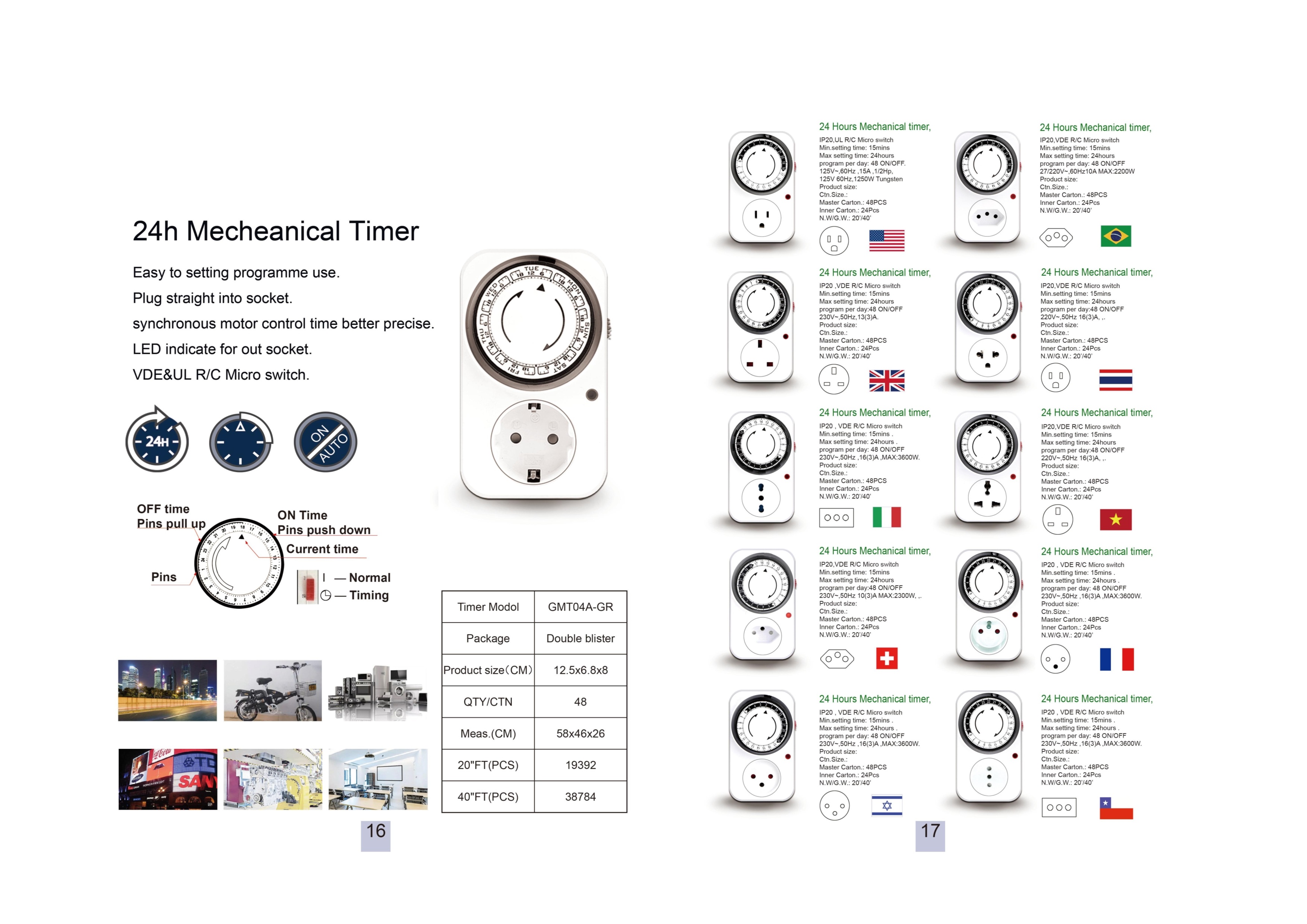 | Product name: mechanical timer socket Shell material: PC Conductive material: nickel-plated bronze Color: blue+white Plug: US/EU/UK Power consumption: less than 1W Rated current: 125V 60Hz 15A Rated power: 1800W Whether processing: yes Timing range: 30 minutes-24 hours Travel time error: less than five minutes (1 day) Working temperature: -10-55° Size: 8*4*8cm |