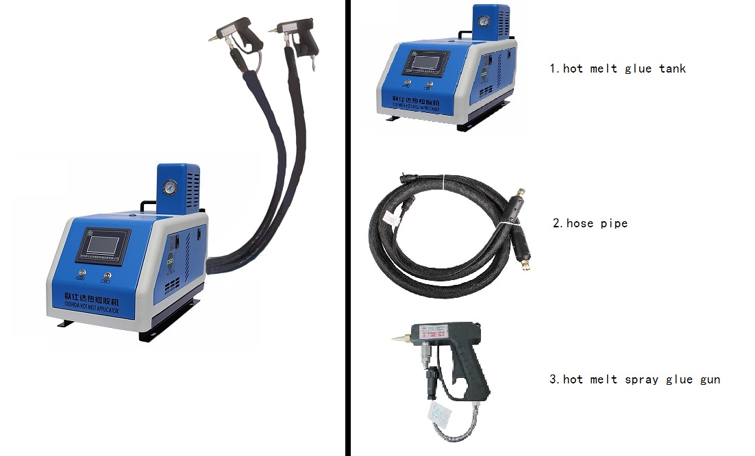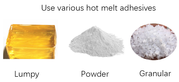 This series of equipment can be widely used in the production of sanitary products (diapers, sanitary products). Air filters, refrigerators, anti-rodent and anti-fly tapes; Non-woven fabric lamination, book binding, label making, carton sealing, cigarette packaging, beverage packaging, double-sided tape, medical bandages; Automotive interior parts, lamp production , windshield installation; carpet production; preheating large roller coating machine or laminator 10-20Kg large capacity hot melt adhesive or customer-specified tank available.