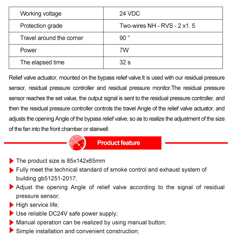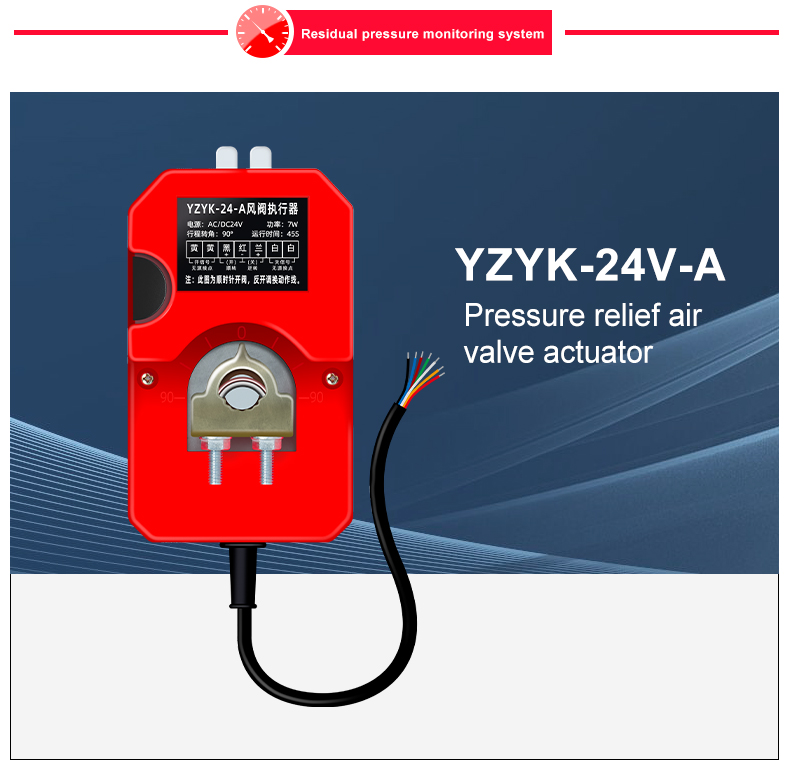 Relief valve actuator, mounted on the bypass relief valve. It works with our Residual Pressure Sensors, Residual Pressure Controllers and Residual Pressure Monitors. When the residual pressure sensor reaches the set value, the output signal is sent to the residual pressure controller. The residual pressure controller controls the stroke of the relief valve actuator and adjusts the opening of the bypass relief valve, so as to achieve the fan entering the front room or stairs. Room size adjustment.