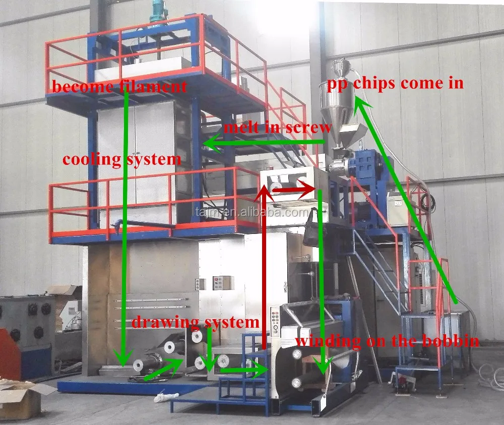 Pp chips--> automatic hopper& loader--> extrusion screw--> melting pipe--> metering pump--> spinning beam--> spinneret and loading units --> blower--> air device--> hot godets--> automatic bobbin change winder