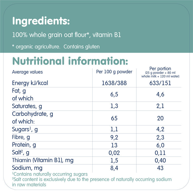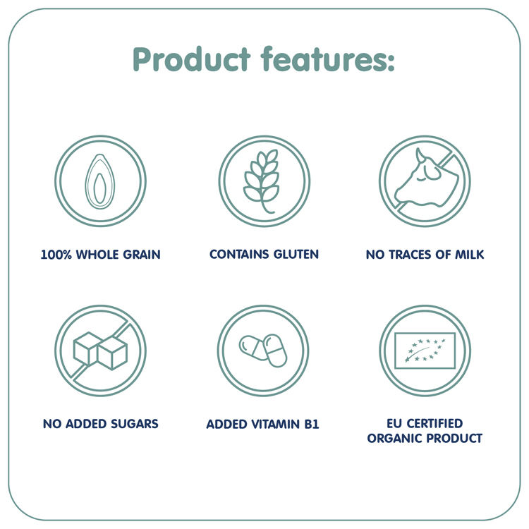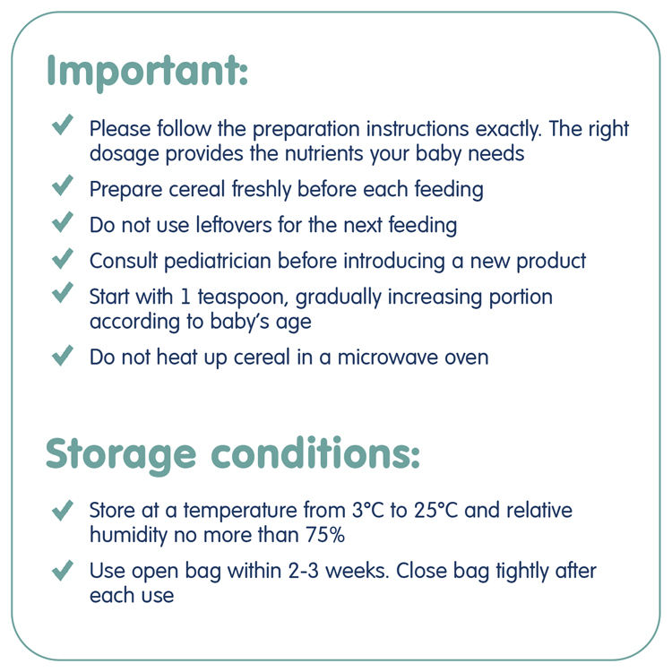 Cereals are the ideal first weaning food. Dissolves easily and quickly without lumps. The fine, airy texture of the ready-made grains in the form of floaters resembles snow, with tiny fluffy bumps as it falls onto the surface. The taste of the grain is natural and inherent to the grain, with a nice aroma of oats.