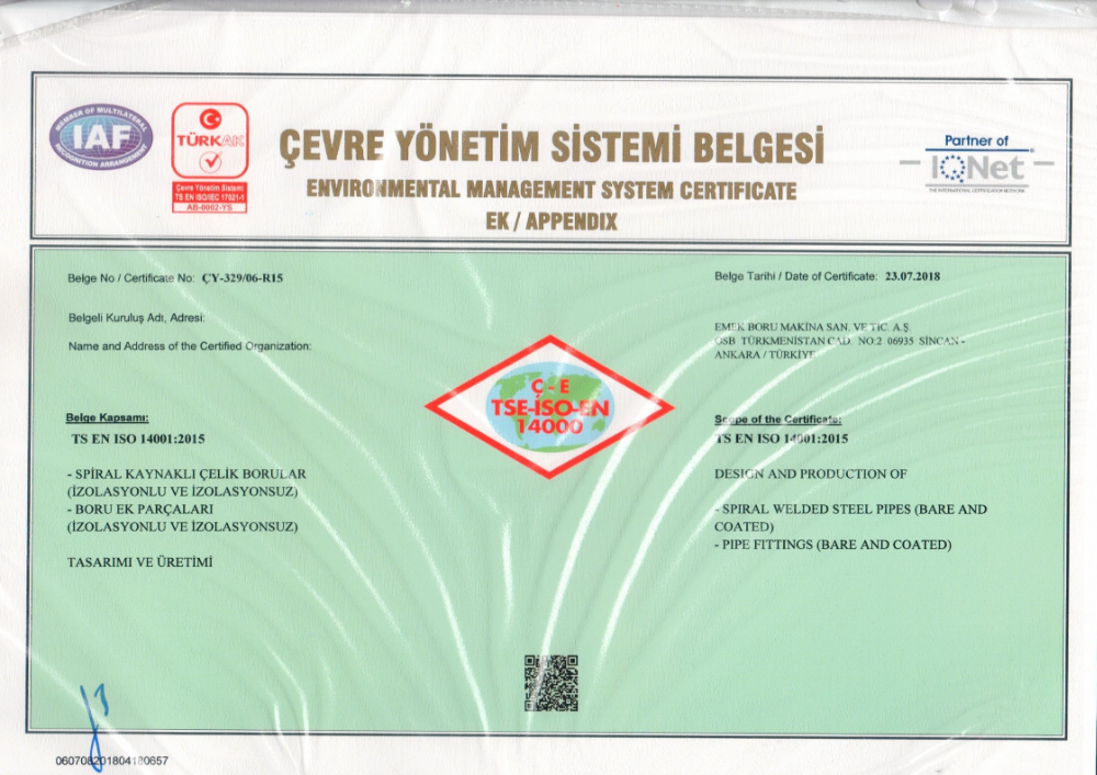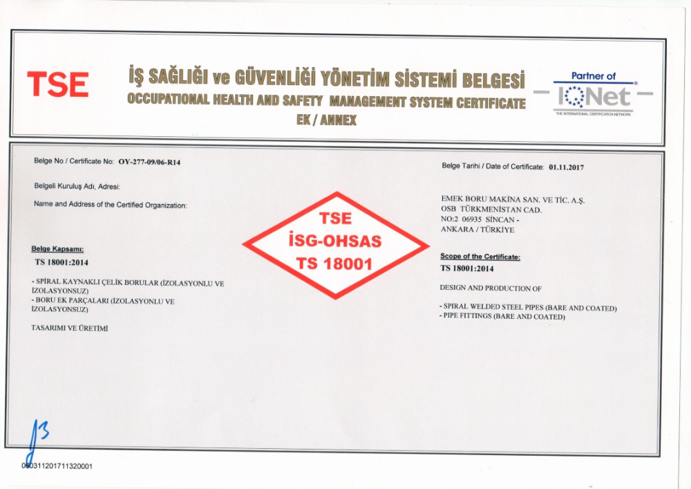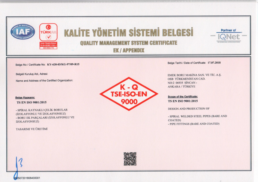 EMEK BORU STEEL PIPE INC maintains the production cycle of its spiral welded steel pipes through 4 independent production lines equipped with the latest state-of-the-art technology, installed and commissioned in its modern manufacturing plant on an open land of 100.000 square meters located in Ankara 30.000 m² of confined space in the first organised industrial zone. These facilities have an annual capacity of 460,000 tons and produce products that are fully compliant with local and international standards. Selecting quality materials in production helps EMEK BORU own and maintain API 5L, TS EN 10217-1, TS EN 10219-1/2, TS 9341 EN 10224, AWWA C210, ASTM A 252 according to its well-established sustainable quality policy DIN 30670, DIN 30678, production certificate and ISO 9001, OHSAS 18001, ISO 14001, 97/23/EC module H system certification.