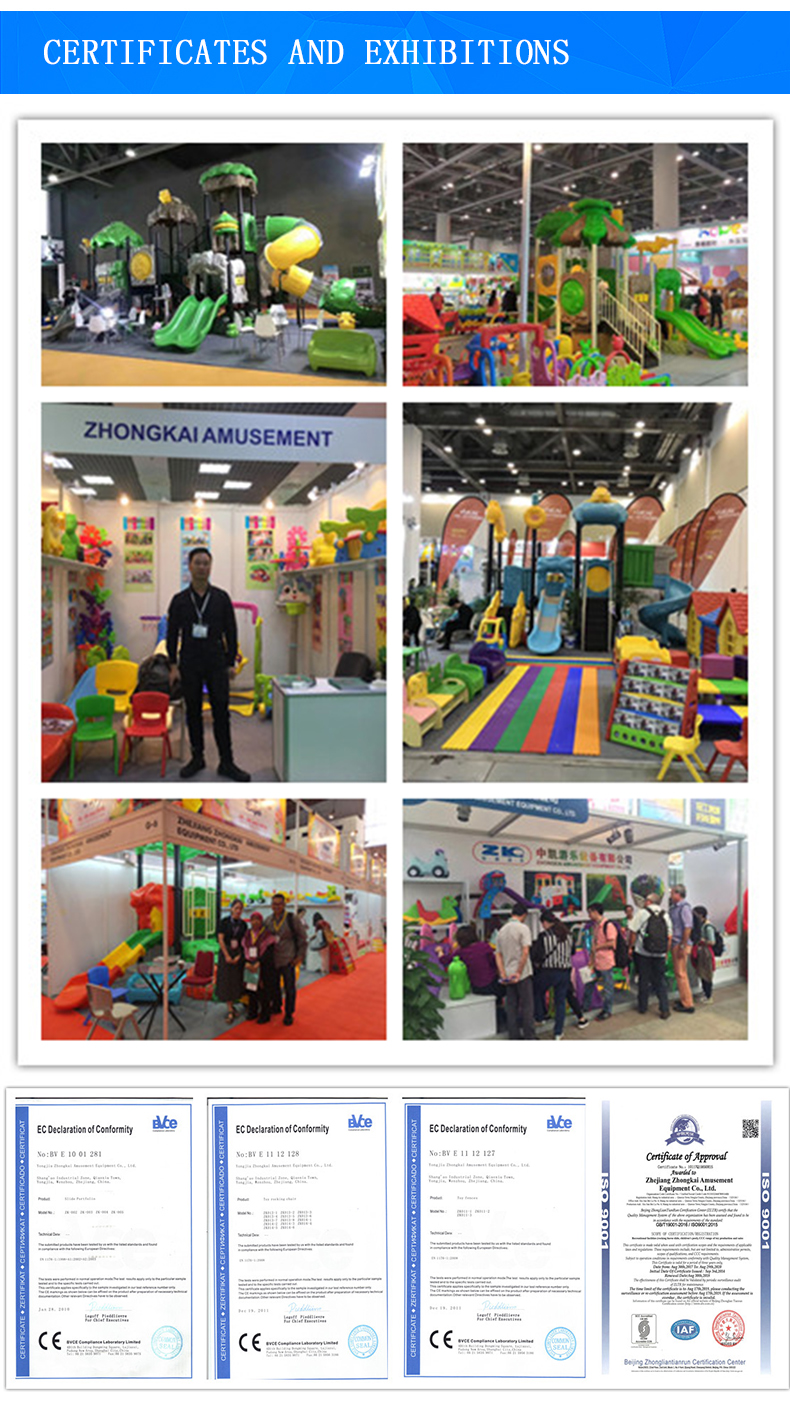 Zhongkai Amusement has specialized in children's amusement products for more than 8 years. It is located in the largest indoor and outdoor children's amusement production base in Wenzhou, Zhejiang. We are producing plastic slides with swings, plastic rockers, children's furniture, swings, seesaws, spring riders, climbing and more