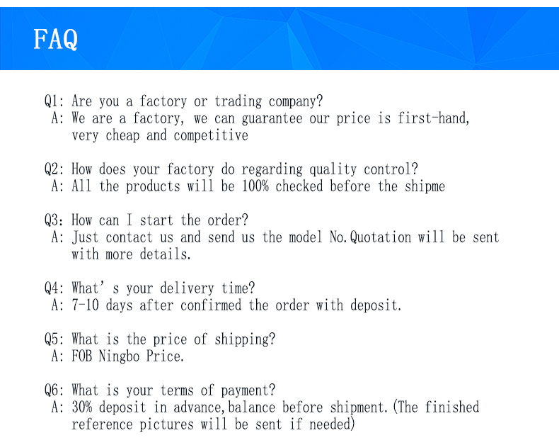 | Payment item: | T/T 30% deposit before production, T/T 70% before shipment | |||||||
