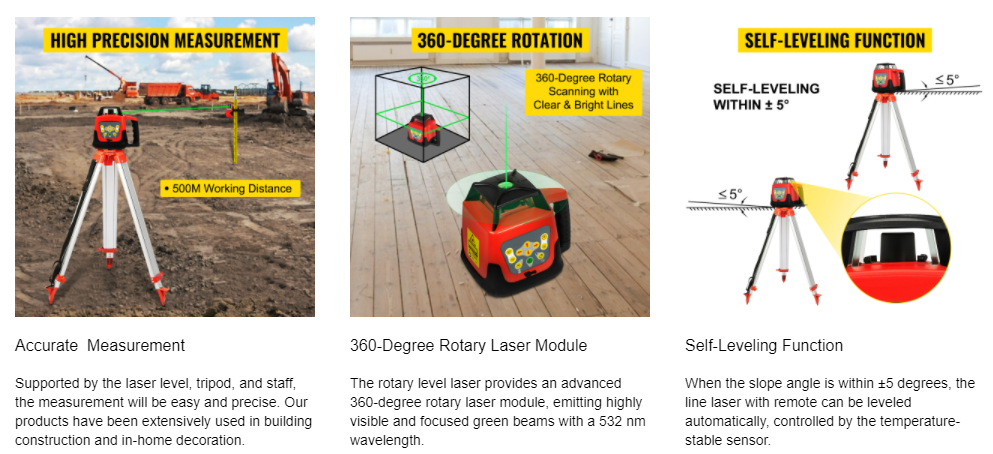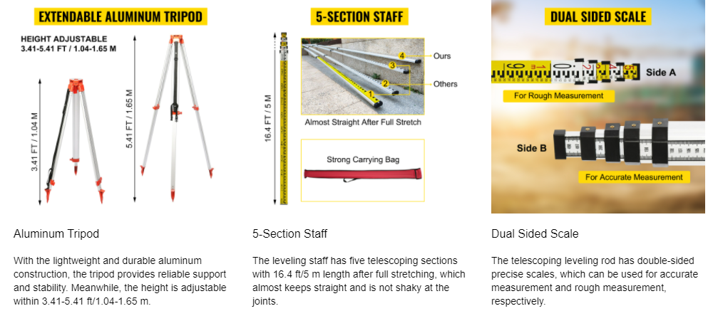 - [Accurate Measurement] - The harmonious combination of laser level, tripod and staff contributes greatly to accurate measurement. Suitable for indoor and outdoor use, our products are ideal for marking, performing precise framing and trussing work, carpentry, shelving and more.