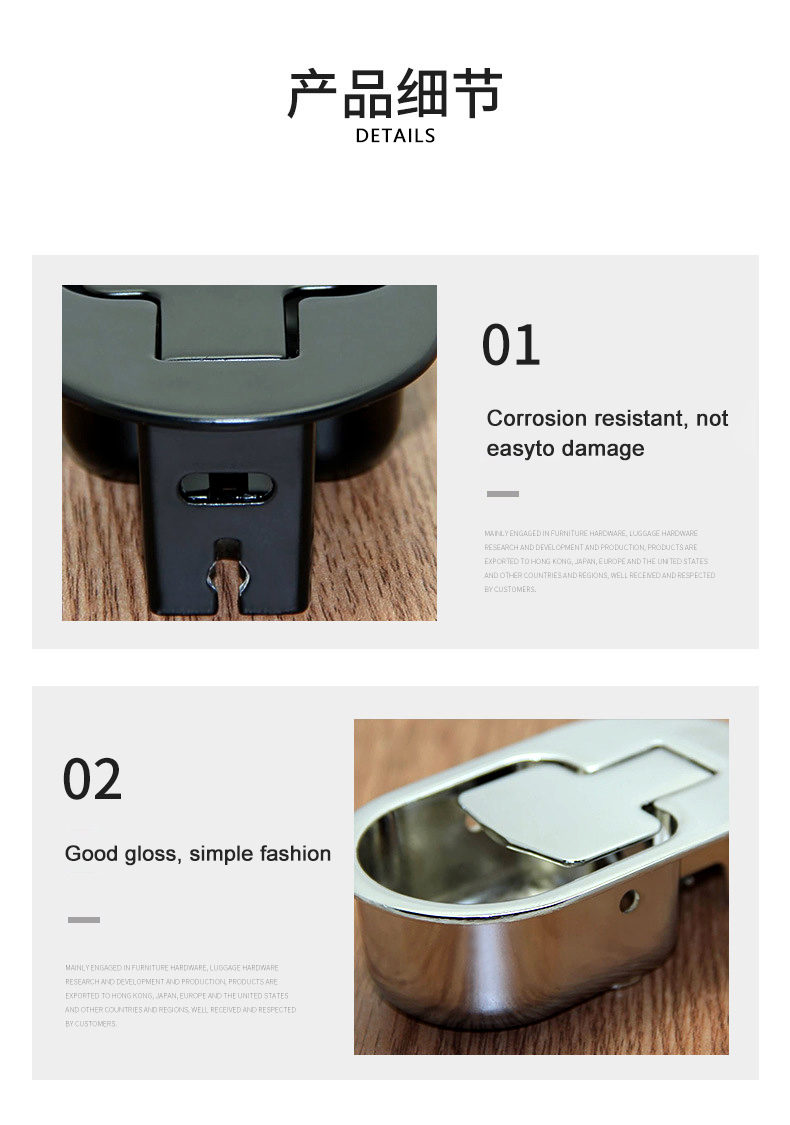 Founded in 1984, the company is a professional manufacturer of hardware products integrating product development, design, production, marketing and service. The company is located in Danzao Town, Foshan City, "China's daily necessities and hardware capital". The company is mainly engaged in: R&D and production of multifunctional furniture hardware and luggage hardware. The company's products are exported to Hong Kong, Japan, Europe and the United States and other countries and regions, and are well received and recommended by customers.
