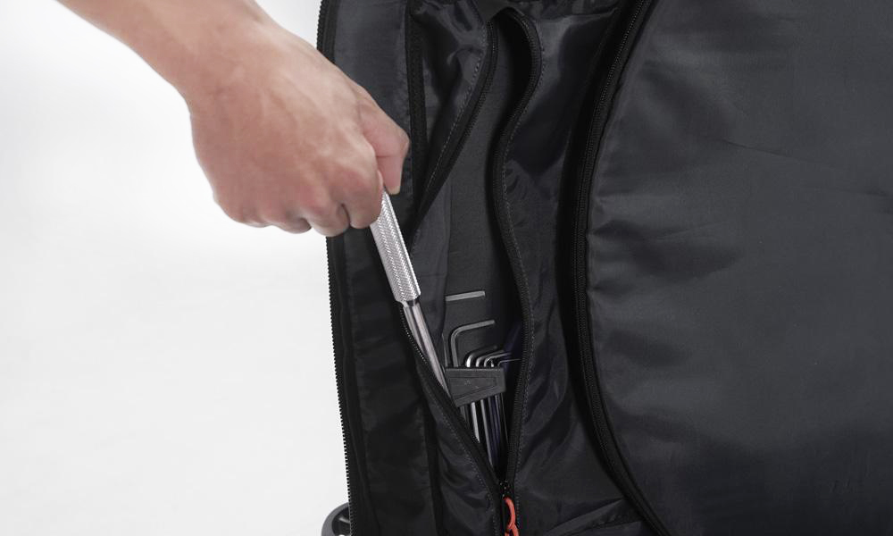Folds for easy storage and movement The transfer bag's rigid side panels can be repositioned to fold up for storage without taking up a lot of space in your home. This is also a great way to transport the box on your back with the straps if you want to assemble your bike at the airport and ride to your destination! | completely separated All parts of the bike have a compartment or strap inside the transfer bag to protect them and keep them organized. From a dedicated rear derailleur bag, bungee sleeves for the fork and pockets for pedals, brake discs and even tools – the transfer bag is designed with every aspect of packing and travel in mind! |
