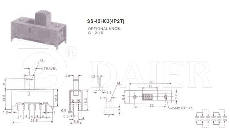Featuring ultra-miniature, micro, miniature, standard, industrial and power versions, Daier has slide switches compatible for printed circuit board, surface mount and panel mount applications. Available in SPST, SPDT, SP3T, DPST, DPDT, 3PDT, 4PDT and 4P3T functions, Daier provides slide switches with positive detent, sealing, and shorting or non-shorting contacts options.