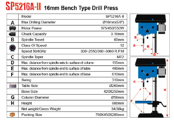 SP5216A-II Small Benchtop Drilling Machine with Large WorktableThe Hobby Drill Press is a compact and sturdy benchtop drill press with the following features:
