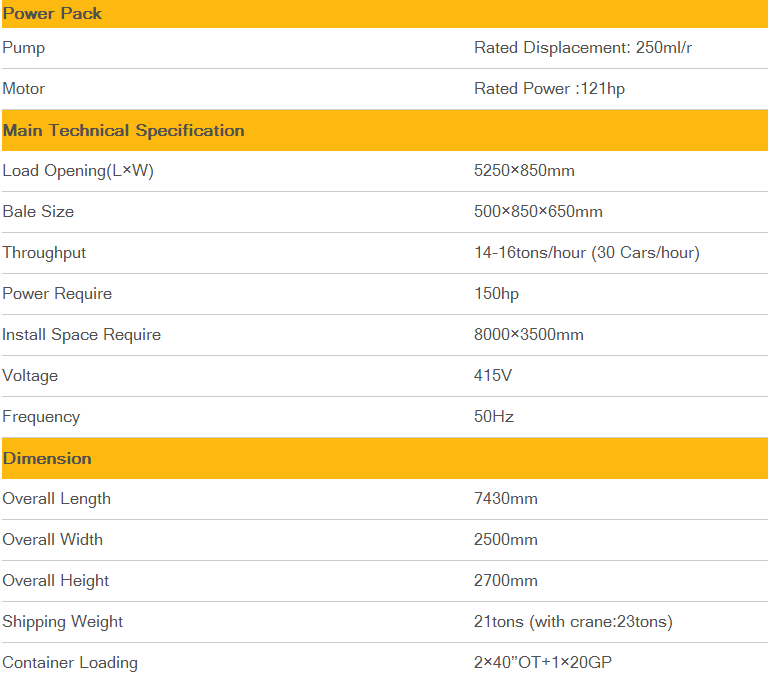 Loading by grab bucket or conveyor belt; no need to install, directly operate the baler; the baler is equipped with a control platform for easy operation