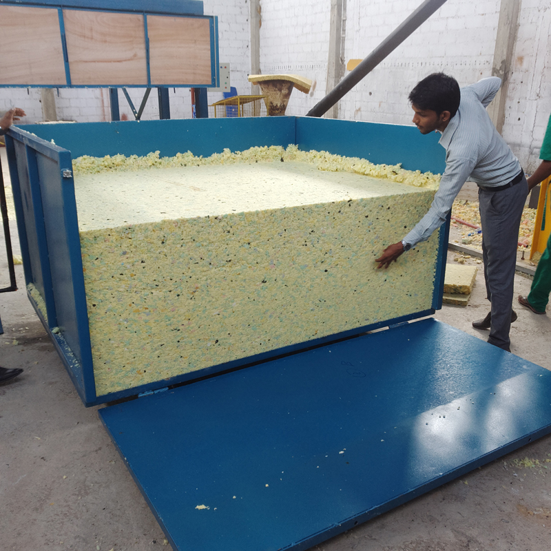 This machine is mainly used to mix the foam block from the foam breaker with the adhesive, blow it into the mixing barrel of the foam rebonding machine, and drop the mixture into the standard size mold L2m×W1.55m×H1.2m , forming ossified foam under hydraulic pressure.