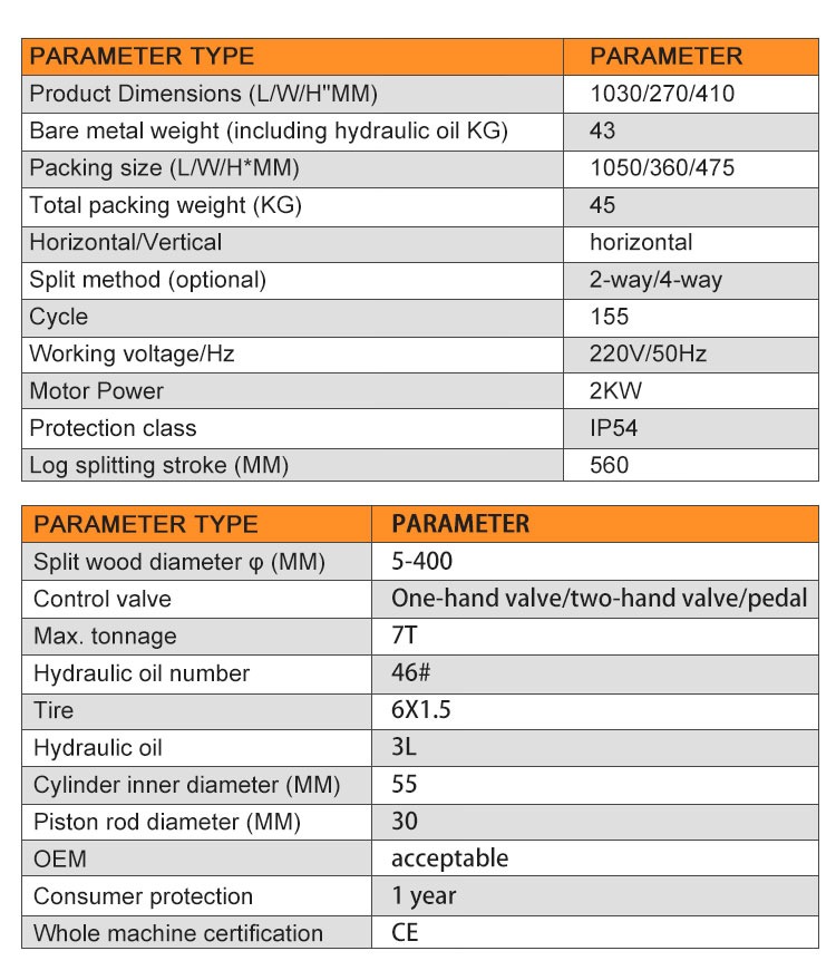 The wood splitter is suitable for small families to split wood, with simple design and durable leather. Key parts adopt safety designs, which ensures the performance of the equipment while making it more user-friendly and safer to use. Ideal for small household firewood, the design is simple and the leather is durable.