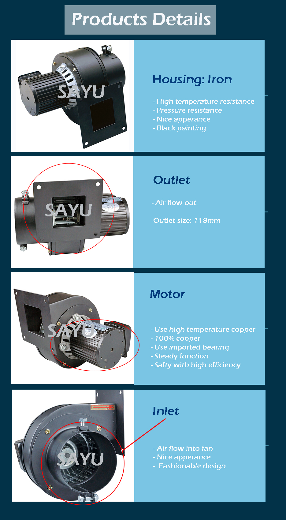 4) Special product requirements, such as changing the outlet direction, special voltage requirements, etc.