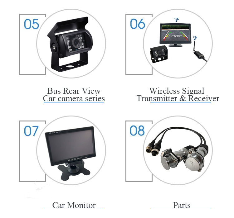 | 07 | Truck and bus rear view vehicle camera series | Lens viewing angle: 90°-170°; Voltage range: 9-12V, 9-24V. |