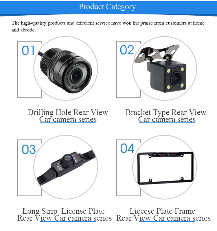 | 02 | Bracket type rear view car camera series | Butterfly bracket, long metal bar bracket; Lens viewing angle: 90°-170°; Voltage range: 9-12V, 9-24V. |