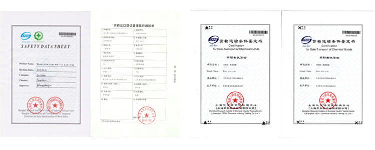 Advantages of our mouse glue traps: Our factory is located in Yiwu City. Our factory mainly produces mouse glue board, mouse glue tube, flying ribbon, flying glue paper and other pest control products. And our factory has their certificate and MSDS, so you can declare and clear customs normally. |