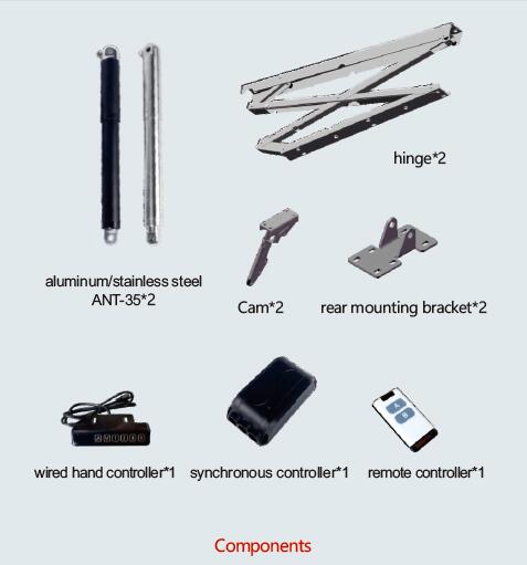 Aluminum/Stainless Steel ANT-35*2, Cam*2, Rear Mounting Bracket*2, Hinge*2, Wired Hand Controller*1, Synchronous Controller*1, Remote Controller*1