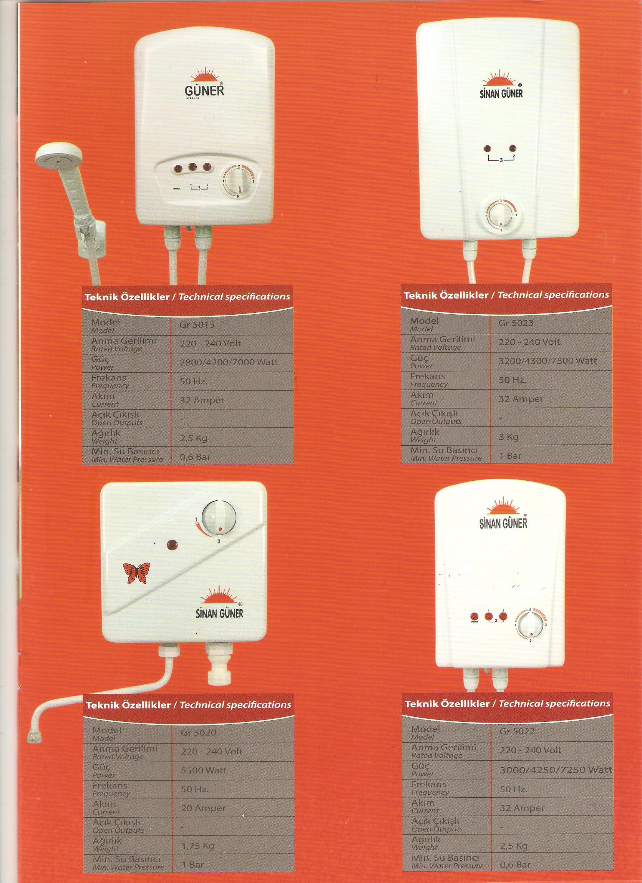 Our tankless water heaters operate on 220-230 volts and range from 3500 watts to 9500 watts. All devices have CE certificate