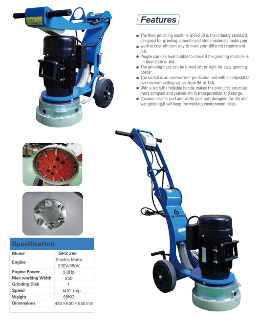 It can be equipped with diamond blades of different sizes, which can realize the grinding of various floors. Such as grinding hardening, water stone, emery and various concretes.