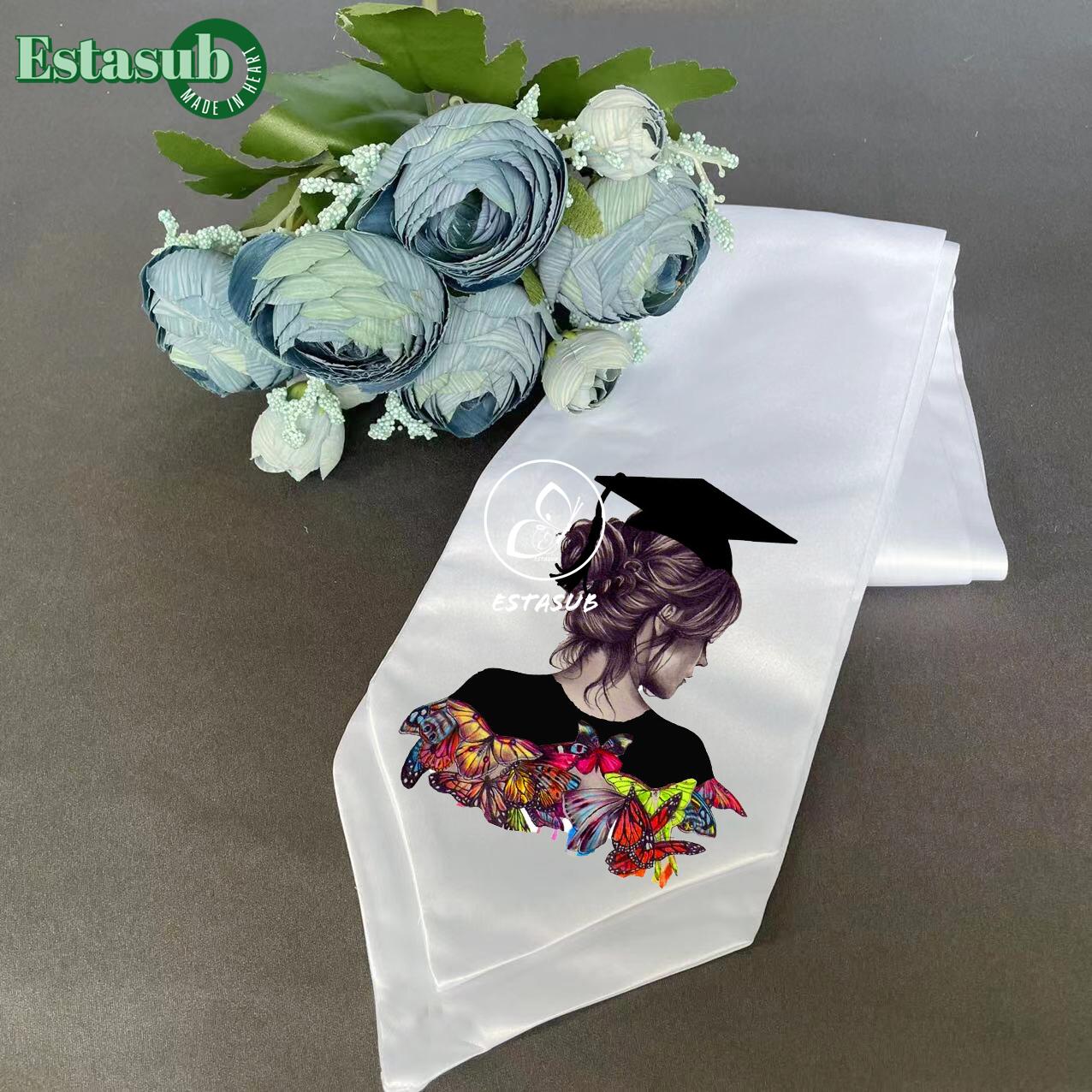 These graduation capes/belts are made of 100% polyester silk satin. You can print on both sides. The total Appx length is 60 inches and 70 inches long. Choose from pure white.