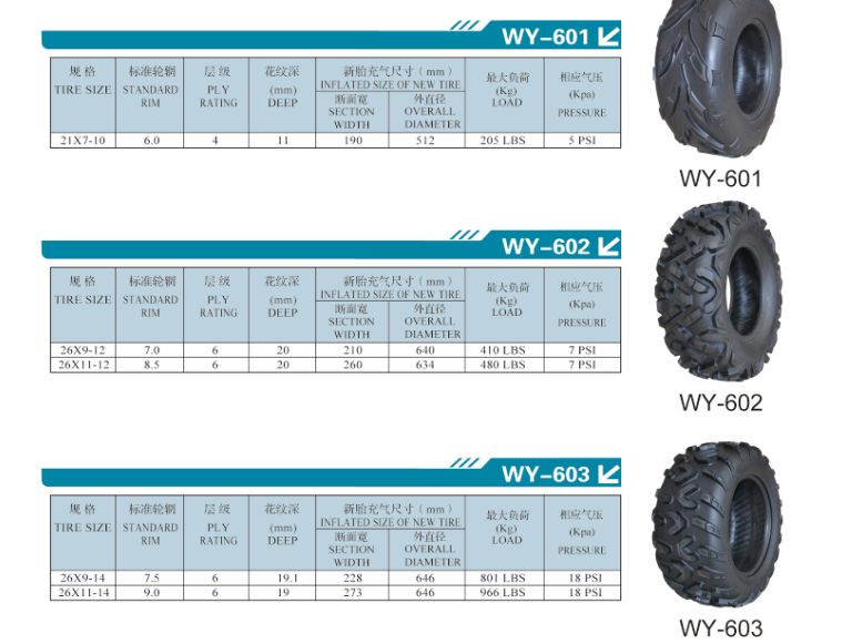 | 26X9-14-6PR, 26X11-14-6PR, 26X9-12-6PR, 26X11-12-6PR, 21X7-10-4PR, 22X10-10-4PR | |