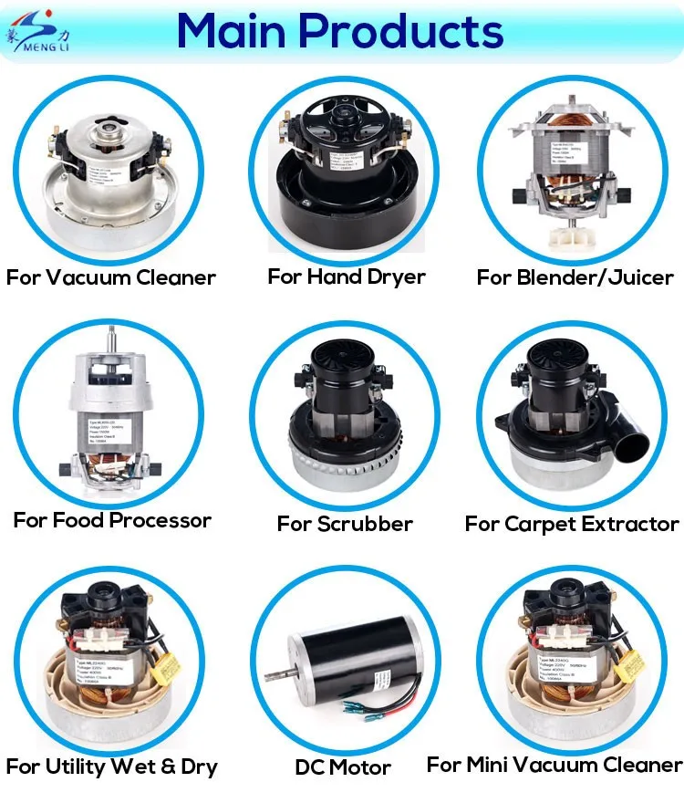 We specialized in the production of AC Motors, Series Motors, DC motors, brushless motors and induction motors. These products are widely applied in wet & dry vacuum cleaners, mini vacuum cleaners, industrial vacuum, carpet extractor/washer, spa bath pumps, juicers, blenders, food processors, coffee makers, ice crushers, sewing machines, line cutting machines, gym equipment and electric hand dryers.