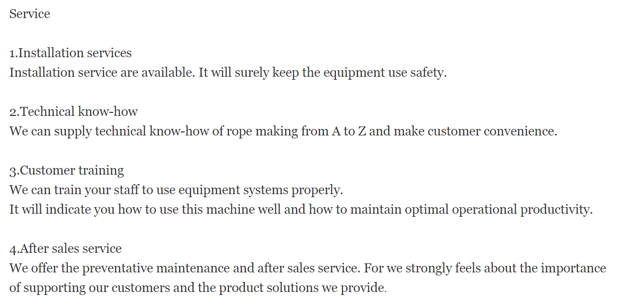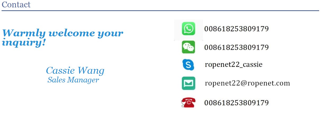 3) Capacity We are proud to guarantee that our delivery time will not exceed 60 days. We have strong production and packaging capacity with more than 800 workers and 5 factories and 3 new industrial parks. Our annual production capacity is more than 10,000 tons on rope products alone.