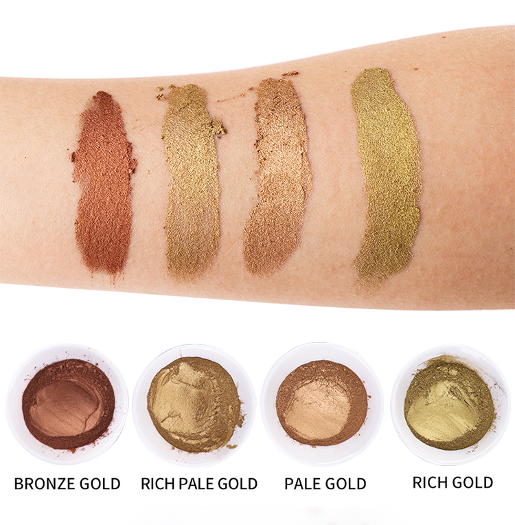 Bronzing powders have a nice sheen and metallic effect. The fewer the number of eyes, the thicker the particles, the stronger the metallic feeling, and the more sparkles. The larger the number of eyes, the finer the particles, the softer the color, and the better the covering power. Available in Rich Gold, Light Gold, Rich Light Gold and Copper Powder. Customers can choose the color and particle size according to their application effects and requirements.