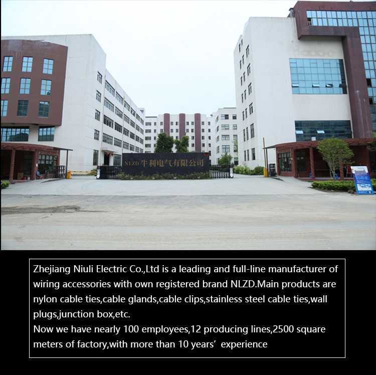 Zhejiang Niuli Electric Co., Ltd. is a leading manufacturer of full-line wiring accessories Own registered brand NL ZD. The main products are Nylon cable ties, cable glands, cable clamps, stainless steel cable ties, wall plugs, etc. NL ZD cable ties are made of 100% fresh nylon PA 6/6 imported from USA, The tensile strength far exceeds the international standard. So far, they have been certified by UL, CE, ROHS, SGS, etc.