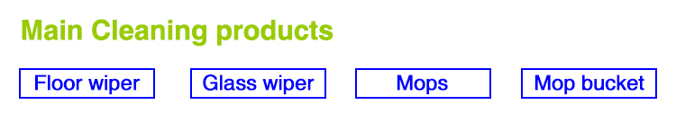 glass wiper,floor wiper, all kinds of mops, mop buckets and trash cans. We upgrade our production lines to improve our efficiency and quality. Our products are inmore than 30 countriesin Europe, Middle East etc.