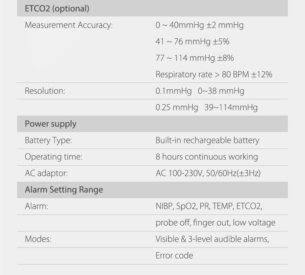 The MD2000C is a new mains/battery powered compact vital signs monitor; this powerful portable platform provides healthcare professionals with a range of measurements including NIBP, pulse rate, oxygen saturation, perfusion index, Bluetooth ear temperature , ETCO2 (optional), Bluetooth blood glucose meter (optional) and Bluetooth scale (optional). Features spot check and continuous monitoring modes