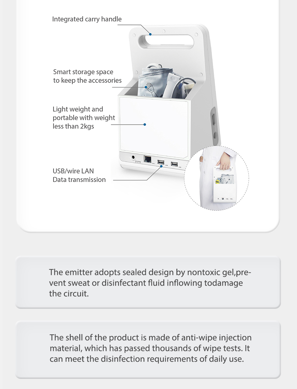 The MD2000C is equipped with a long-life 8-hour high-capacity battery pack for use in any healthcare environment.