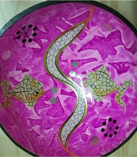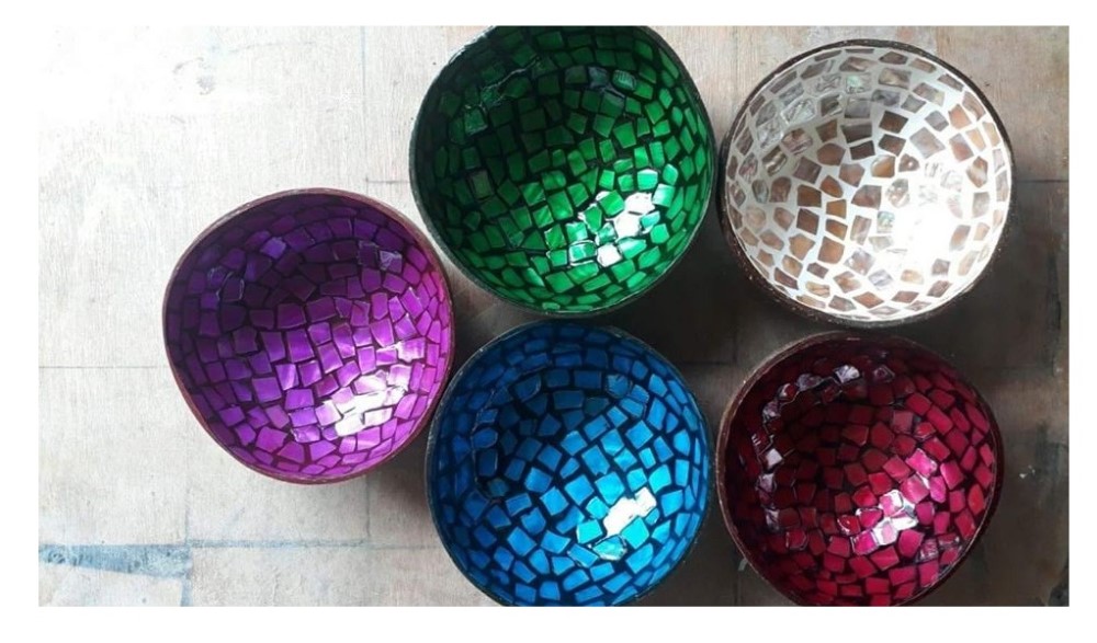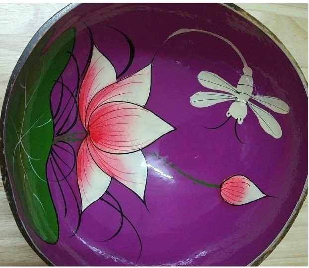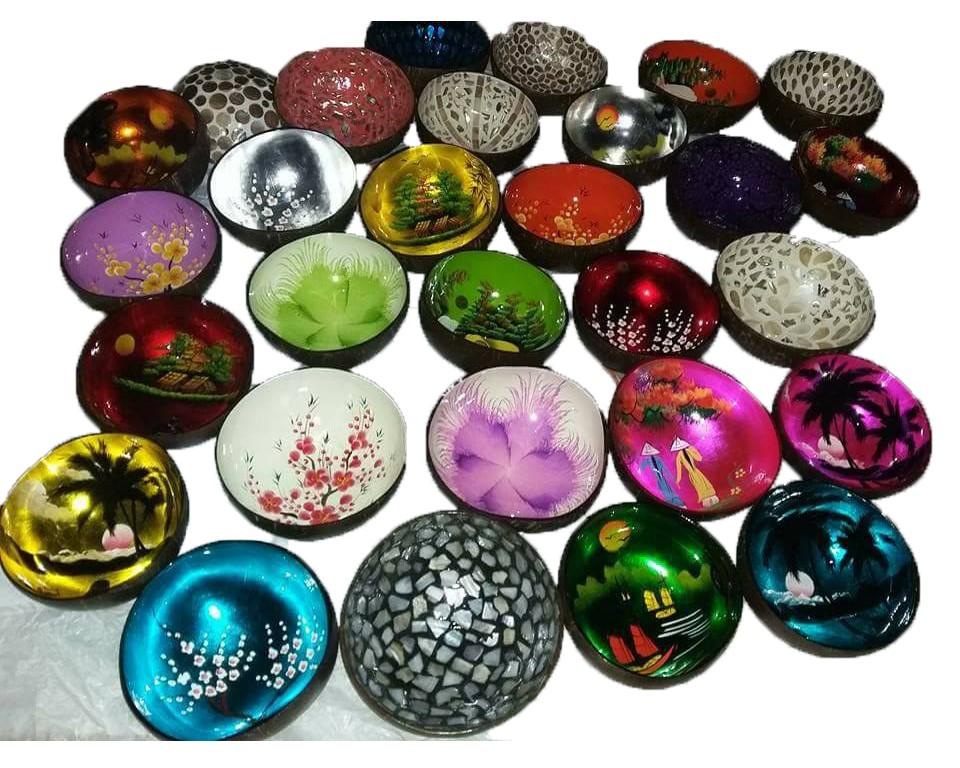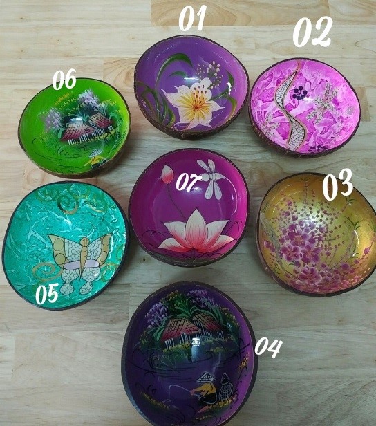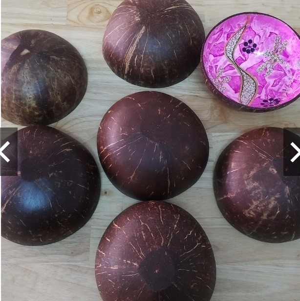 Product is made from coconut shell. On the outside, the pristine casing is smooth and unpolished. Inside is colorful lacquer. This product is waterproof and suitable for dry goods or decorations. Because the product is painted, it is not suitable for direct consumption. Product weight 95gr, diameter 11-13cm, height 4-5cm.