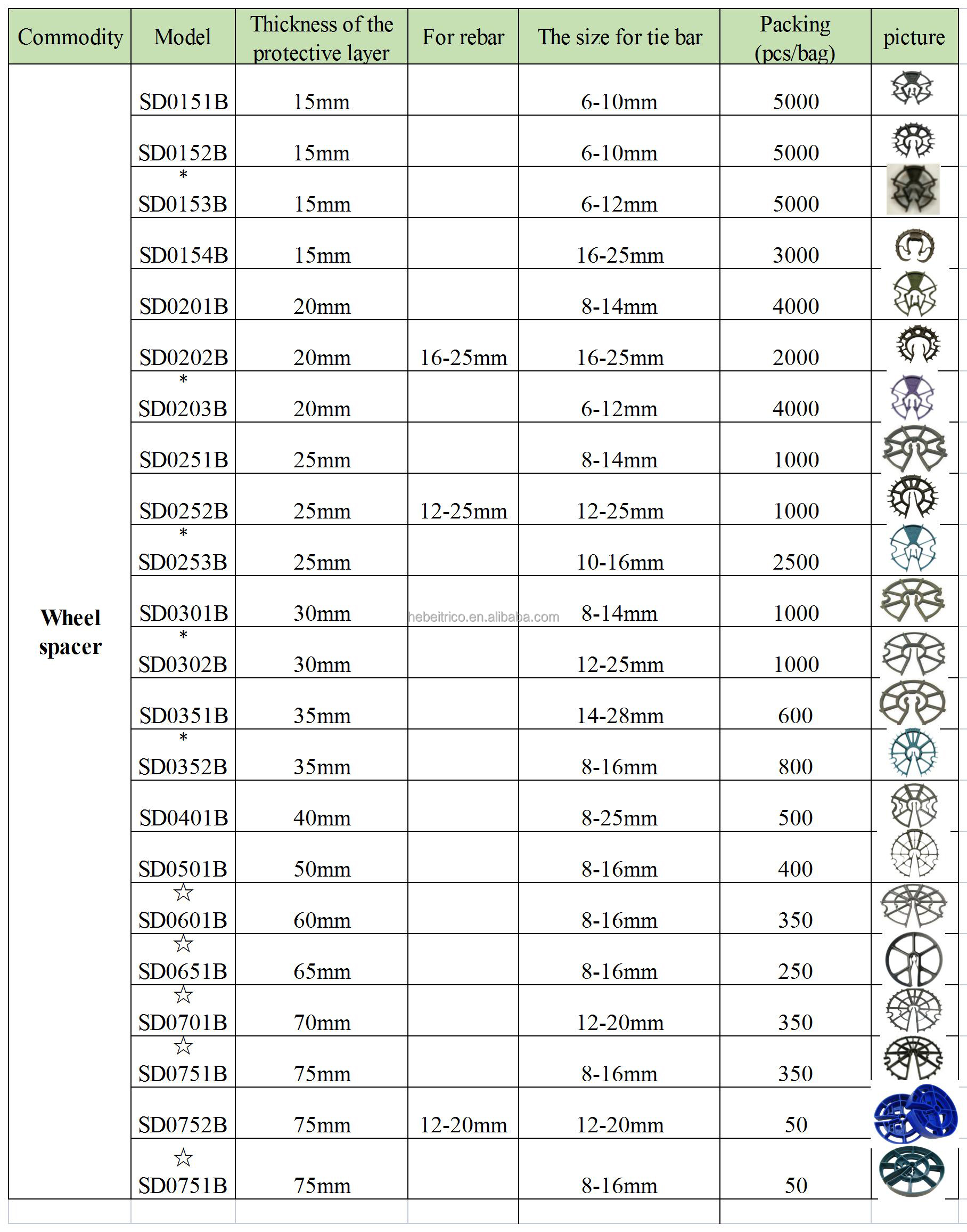 We have different types of plastic rebar spacers such asPlastic reinforced wheel spacers, plastic reinforced chair pads, plastic reinforced clamp pads, plastic plate pads, plastic reinforced caps, plastic reinforced ladder pads, etc.