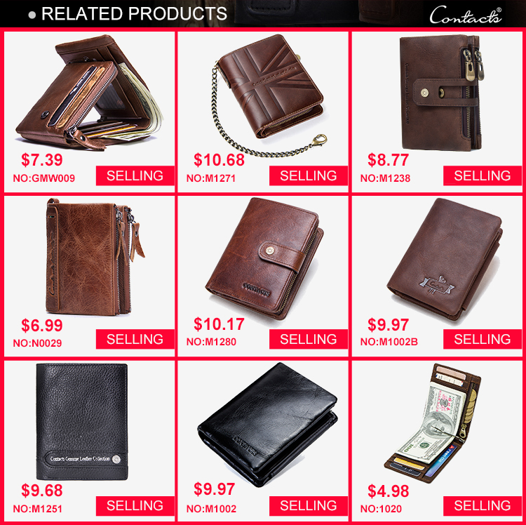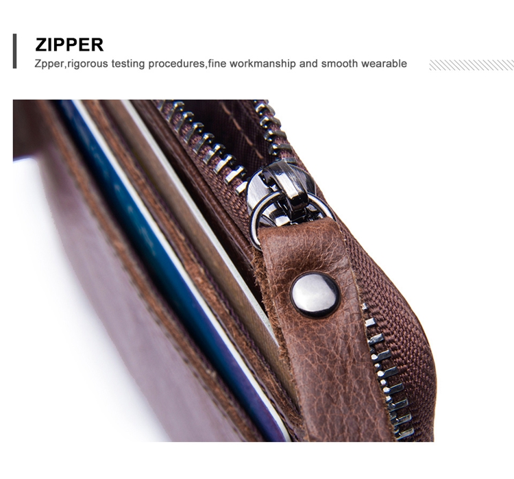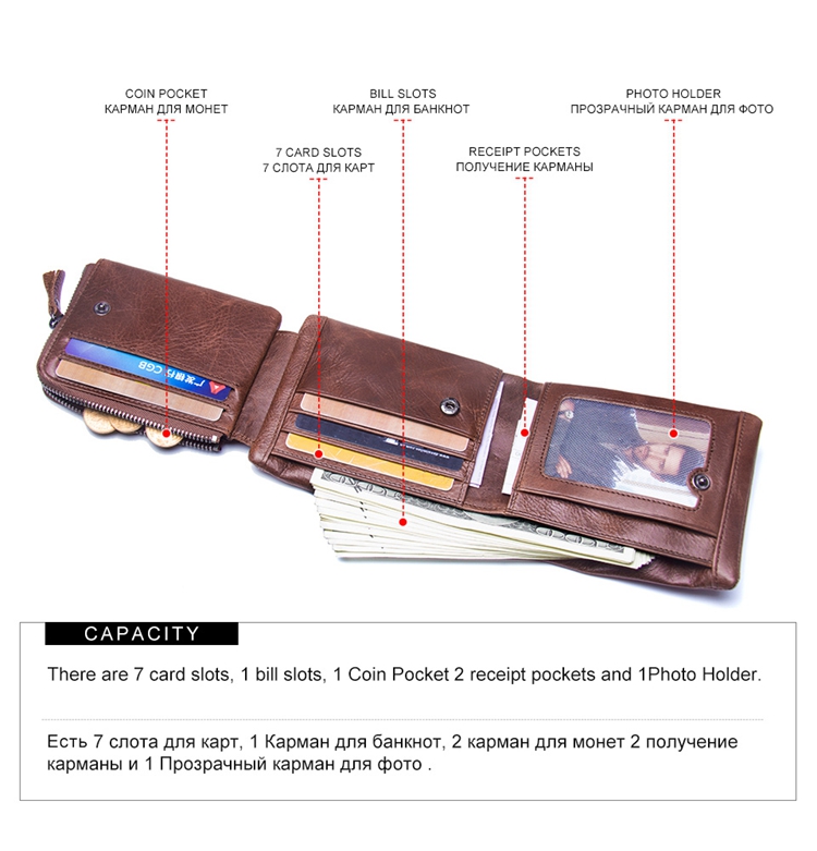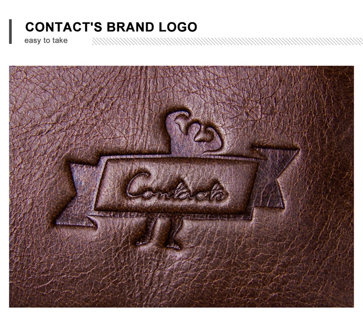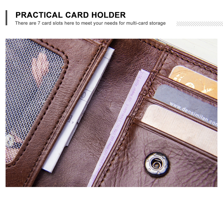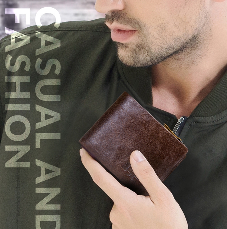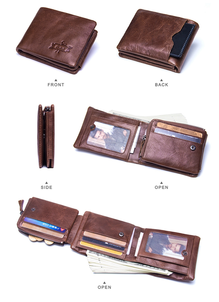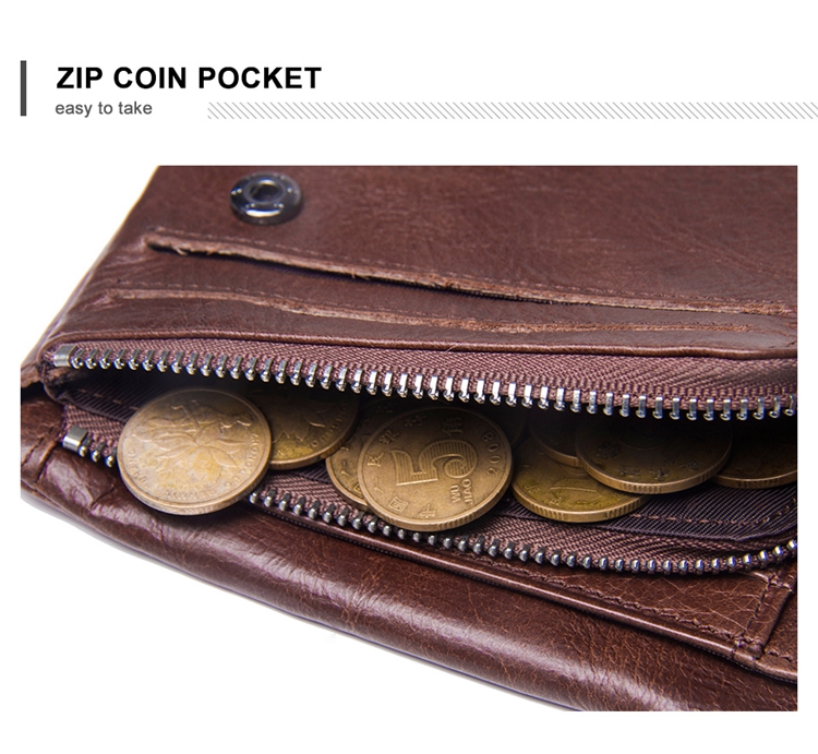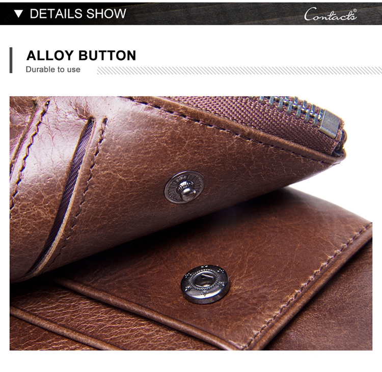 Contact's Factory Wholesale Crazy Horse Leather Tri-Fold RFID Blocking Zipper Pocket Genuine Leather Coin Card Men's Wallet