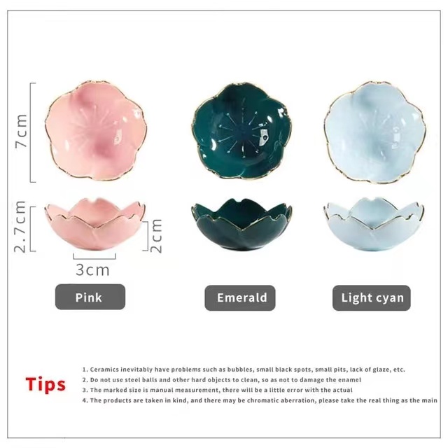 Flower ceramic dish seasoning dip bowl cherry blossom ceramic dish cherry blossom decoration Plato sauce dish kitchen flower dish describe This is a seasoning pot made of smooth ceramic material that is lightweight, fast, shatterproof, safe and tasteless. Combine your sauce bowl with a small body to keep the table from looking cluttered. Easy to clean and use. Separate flavor settings prevent mixing of flavors. feature Name: Ceramic tableware - Color: As shown. - Material: Ceramic. - Size: Approx. 7x7x2.8 cm. - Made of high quality ceramic material, more healthy, safe and durable. - Suitable for family, kitchen, party or outdoor camping, BBQ, picnic, etc. - You can use it on different occasions to classify many kinds of condiments. - The seasoning plate is suitable for sushi utensils, and other sizes are also suitable for placing seasonings. - Ideal for serving sauces, salt, vinegar, sugar, salads, flavors, spices, snacks and appetizers, etc. |