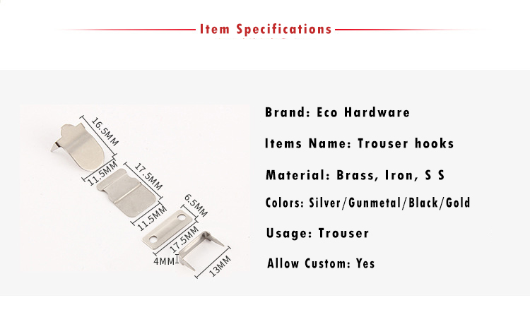 | Product Category: | Custom Brass Stainless Steel Silver/Gold Metal Pants Pants Hooks and Bars |