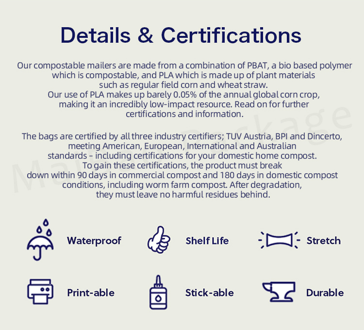 | model: | Biodegradable Mailing Bags | Material: | HDPE/LDPE/co-extruded film/biodegradable materials, etc., POLY |
