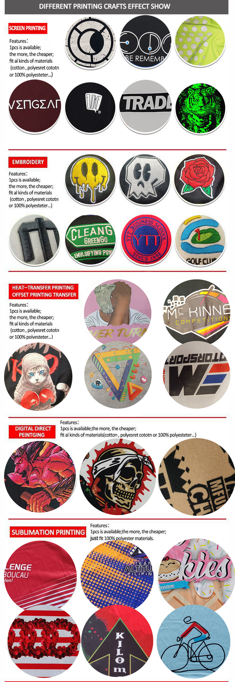| Graphic printing technology: | Screen printing, UV printing, heat transfer printing, emboss printing, digital printing, embroidery, embossing, applique embroidery | Printing method: | Embroidery/sublimation/3D/screen printing/heat transfer printing |